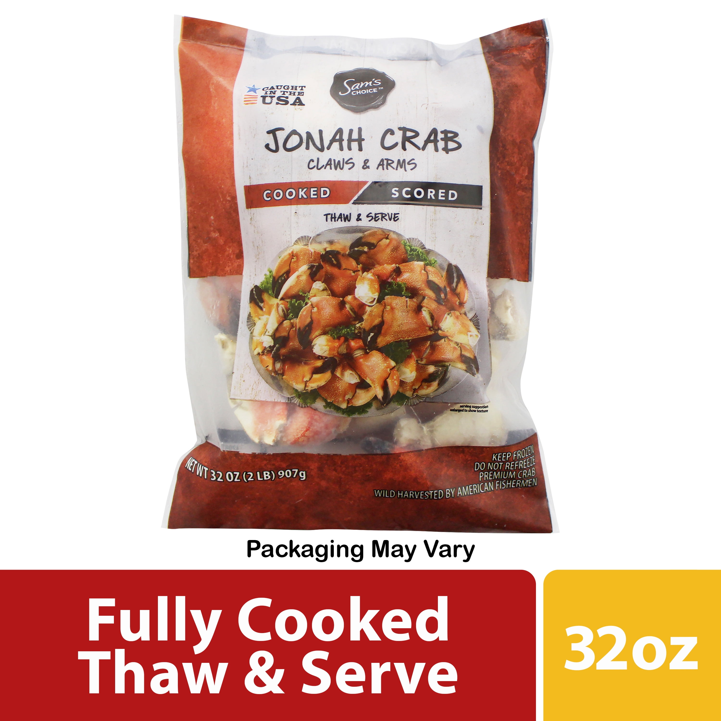 Sam's Choice Frozen Cooked Jonah Crab Claws and Arms are wild caught in the United States and sourced from the cold waters of the North Atlantic Ocean. These claws and arms are fully cooked in their shell to preserve their natural mild, sweet flavor, and the shell is scored for your convenience. Preparation is quick and easy. Just thaw and heat, making them perfect for any level of cooking skill. Enjoying your favorite seafood is easy with Samâs Choice Frozen Wild Caught Cooked Jonah Crab Claws...
