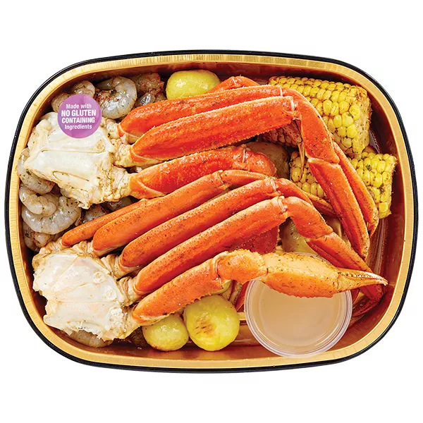CORN ON THE COB, RAW SHRIMP (SHRIMP, WATER, SALT), COOKED CLAMS, POTATOES, COOKED ANDOUILLE SAUSAGE (PORK, WATER, SPICES, SEA SALT, PAPRIKA, GARLIC POWDER, ONION POWDER), RAW TILAPIA, SPICY BUTTER SAUCE (BUTTER [CREAM (MILK), SALT], WATER, GARLIC, ONION POWDER, PAPRIKA, BROWN SUGAR, SUGAR, SALT, RED PEPPER, CORNSTARCH, LEMON POWDER (CITRIC ACID (ACIDULANT), LEMON OIL, LEMON JUICE), MODIFIED CORNSTARCH, XANTHAN GUM, OREGANO).