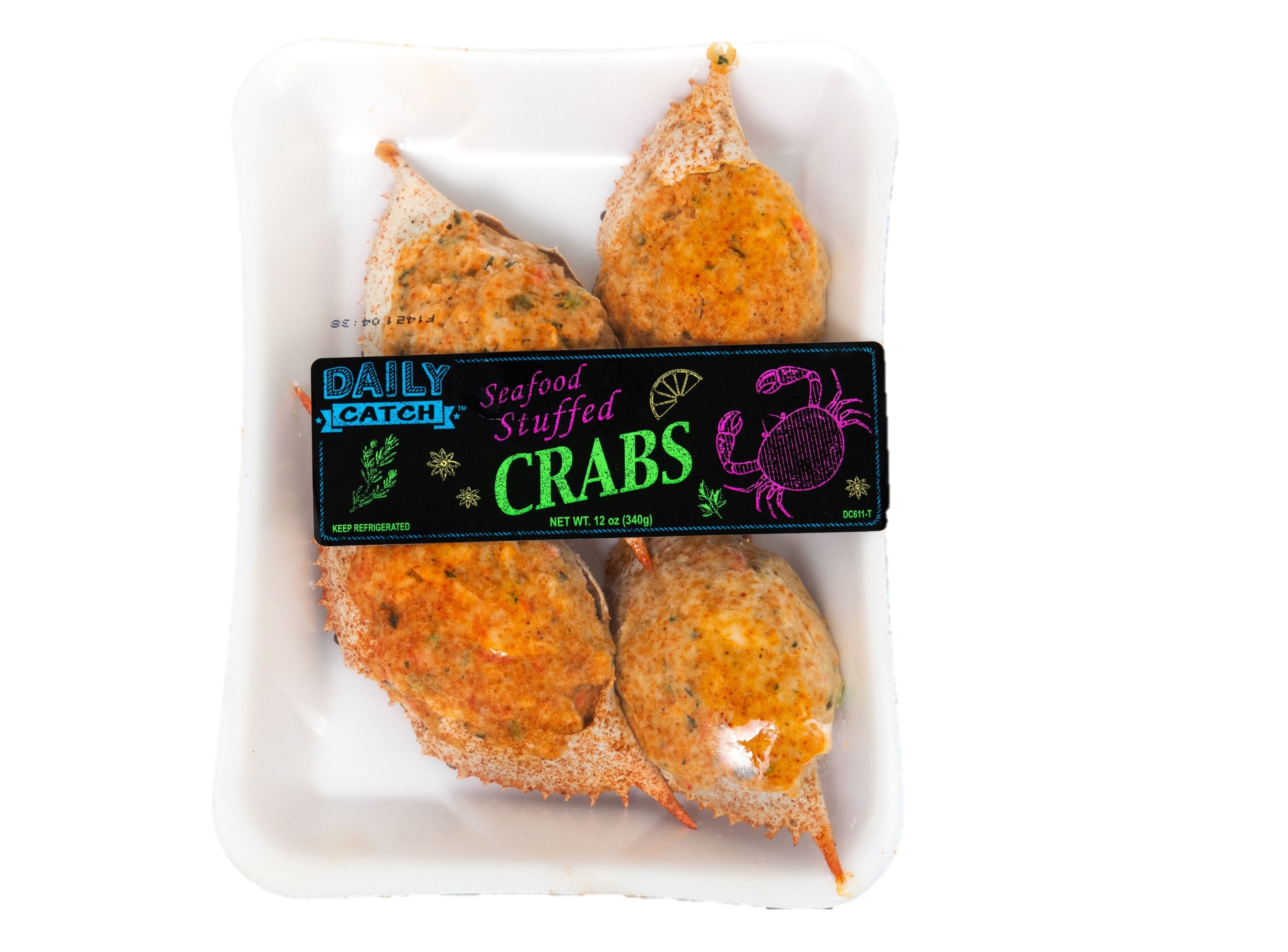 Crabmeat, Imitation Crab (fish protein [pacific whiting, sugar, sorbitol, egg white powder, sodium tripolyphosphate, tetrasodium pyrophosphate], water, wheat starch, modified tapioca starch, sugar, sorbitol, salt, soybean oil, rice wine [rice wine, sugar syrup, water, ethanol, salt, disodium succinate, disodium inosinate and guanylate], crab extract [crab extract, dextrin, salt, glycine, sugar, DL-Alanine, disodium inosinate, disodium succinate, crab flavor, xanthan gum], egg white powder [egg solids, citric acid], artificial crab flavor, crabmeat extract [crab extract powder, glycine, salt, dextrin, sugar, disodium succinate, hydrolyzed soy protein, DL-Alanine, disodium inosinate and guanylate], titanium dioxide, carmine and paprika [color]), Bread Crumbs (wheat flour, salt, soybean oil, high fructose corn syrup, yeast), Water, Mayonnaise (soybean oil, egg yolks, water, distilled vinegar, salt, cider vinegar, egg white solids, oleoresin paprika, natural flavor), Onion, Celery, Soybean Oil, Potato Starch, Red Bell Pepper, Green Bell Pepper. Contains less than 2% of the following: cultured sugar, vinegar, maltodextrin, natural and artificial flavors (crab, cod, pollock), yeast extract, crab powder, carrot fiber, distilled vinegar, mustard seed, mustard bran, turmeric, paprika, modified cornstarch, sea salt, hydrolyzed corn protein, garlic powder, spices, parsley, disodium inosinate and guanylate, lactic acid, xanthan gum, citric acid, corn syrup solids, lemon juice solids, lemon oil, potassium sorbate and sodium benzoate (preservatives). Garnished with: salt, sugar, dehydrated bell pepper, spices, paprika, corn flour, natural spice extractives. Contains Crustacean (crab), Fish (cod, pollock, whiting), Egg, Soy, and Wheat.