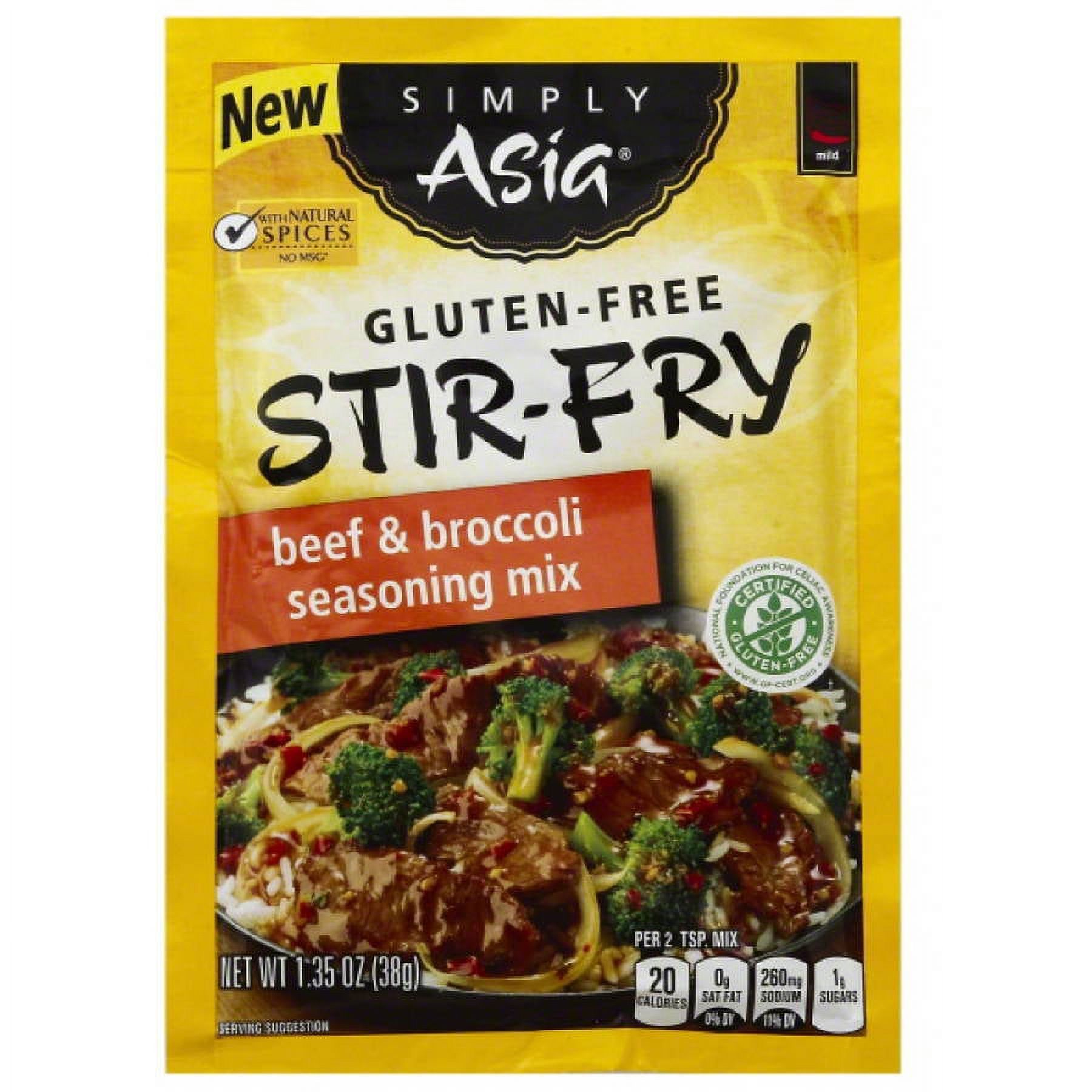 Stir-Fry Seasoning Mix from Simply Asia is an easy way to liven up your meals. Just add it in while you cook for a more authentic flavor. This beef and broccoli seasoning mix includes natural spices. At just 20 calories per serving, the product is easy on your diet plan. The gluten-free recipe makes this food safe for people with Celiac to eat. Its mild spiciness level means that you get lots of flavor with just a little heat. These seasonings are free of fat and have no cholesterol. There's no MSG...