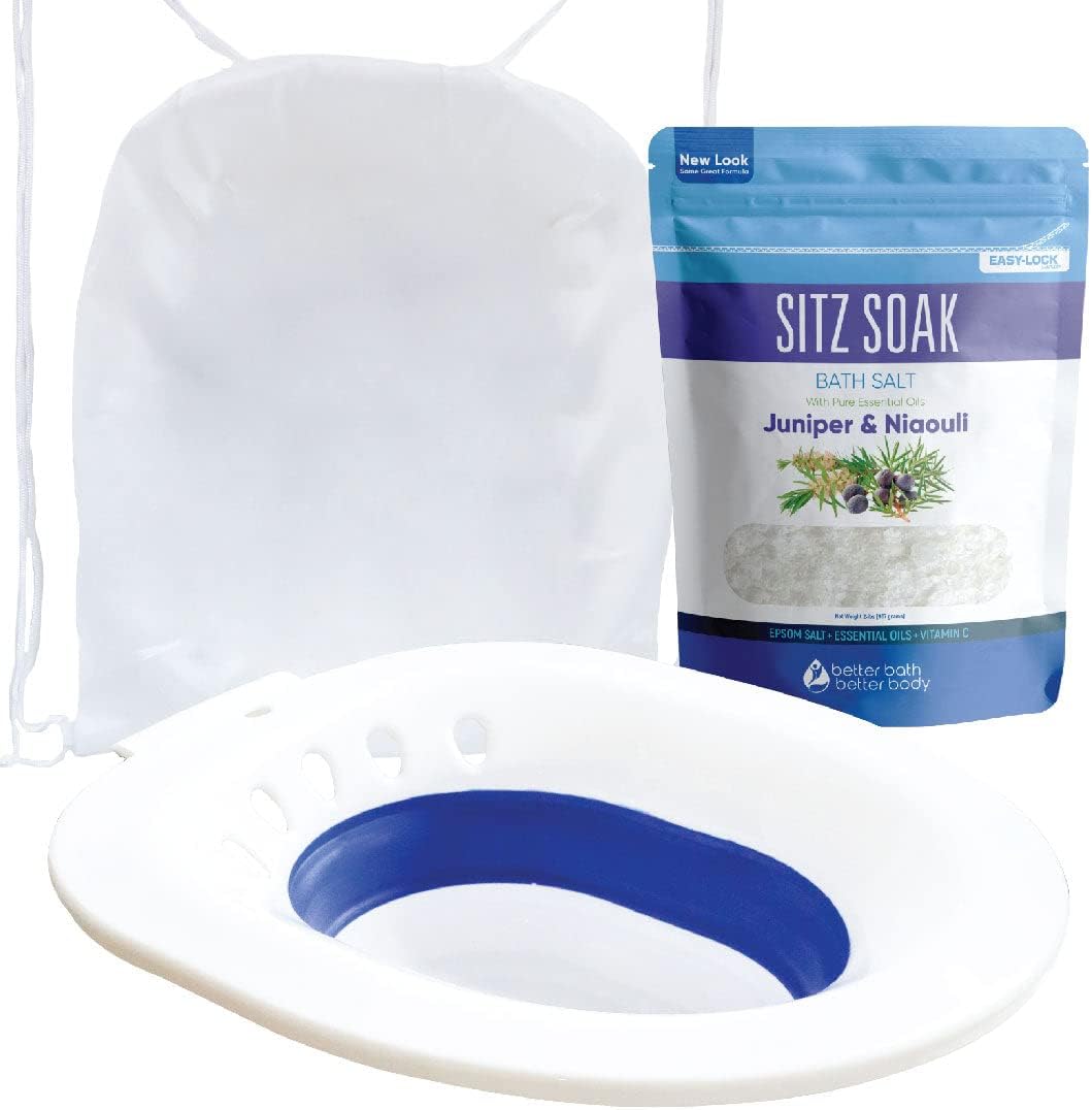 New Sitz Bath Tub Bundle Kit - Sitz Tub and Sitz Bath Soak Plus Drawstring Bag - Soothes Hemorrhoids, Perineum, Postpartum, Yoni Steam - Collapsible, Easy Storage Bag and 2-Lbs Sitz Bath Salt