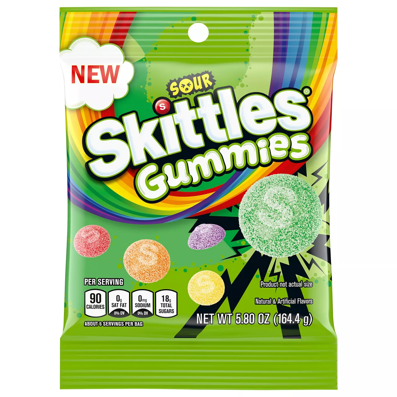 STOP SCROLLING! You asked for SKITTLES Gummies - We said "Let's Do It!" Now, we are taking fruity chewy candy deliciousness to the next level with all NEW SKITTLES Sour Gummies Assortment. Enjoy everything you love about SKITTLES Sour candy now in chewy gummy candy form. A soft and fruity mix of sour strawberry, sour green apple, sour lemon, sour orange, and sour grape flavored assorted chewy candy. Each SKITTLES Sour Gummy is dime-sized, provides a highly satisfying chew (especially when you eat...