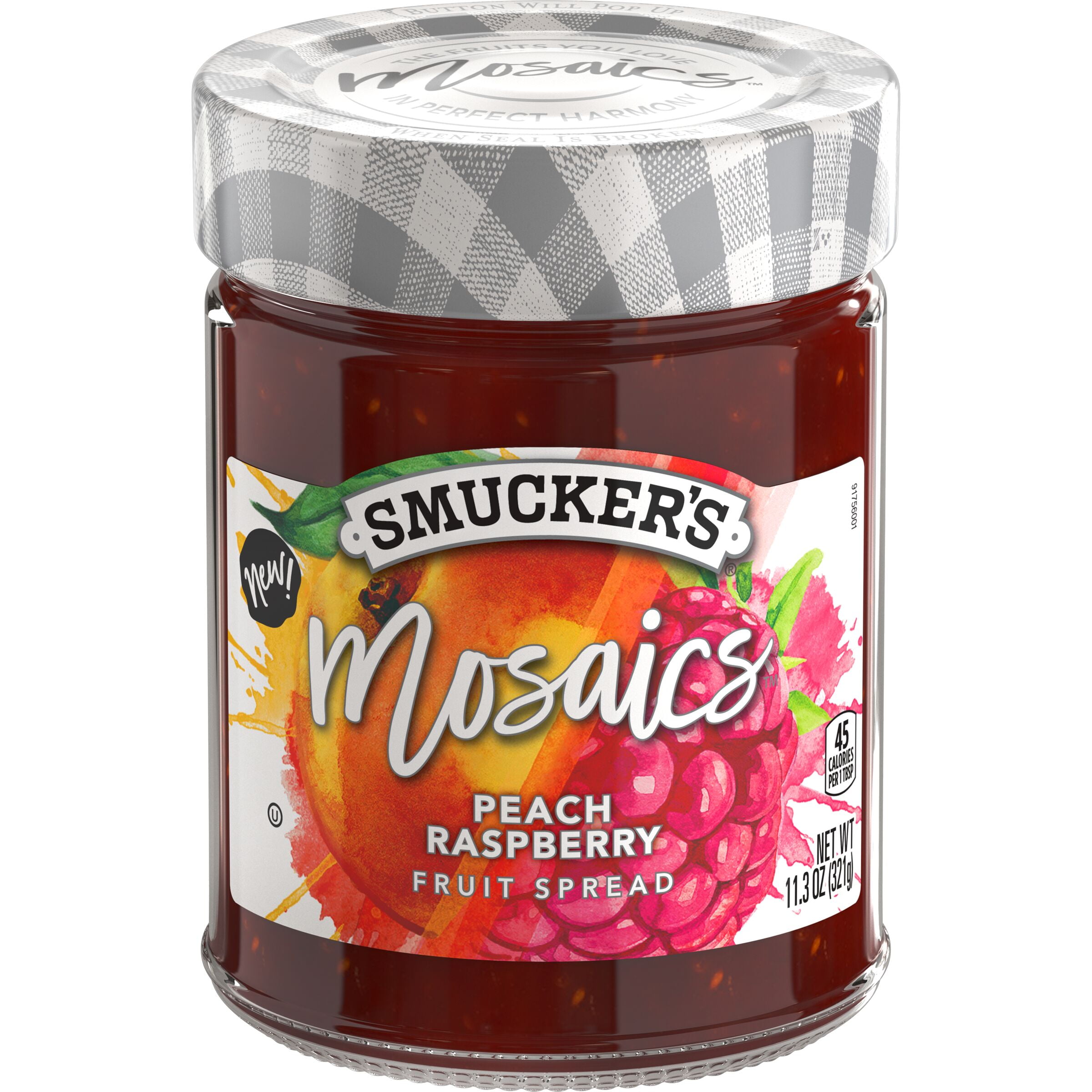 Your favorite fruit flavors collide in Smuckerâs Mosaics Peach Raspberry Fruit Spread. With its unique taste and mouthwatering pieces of real fruit, itâs the fruit spread you never knew you always wanted. It blends peaches and raspberries to perfection for a sweet and complex flavor you'll love. Not only is it delicious, but it's fat free and has no high fructose corn syrup. This is the perfect spread to pair with baked goods or to swirl into your morning oatmeal. After one tasty spoonful, you'll...