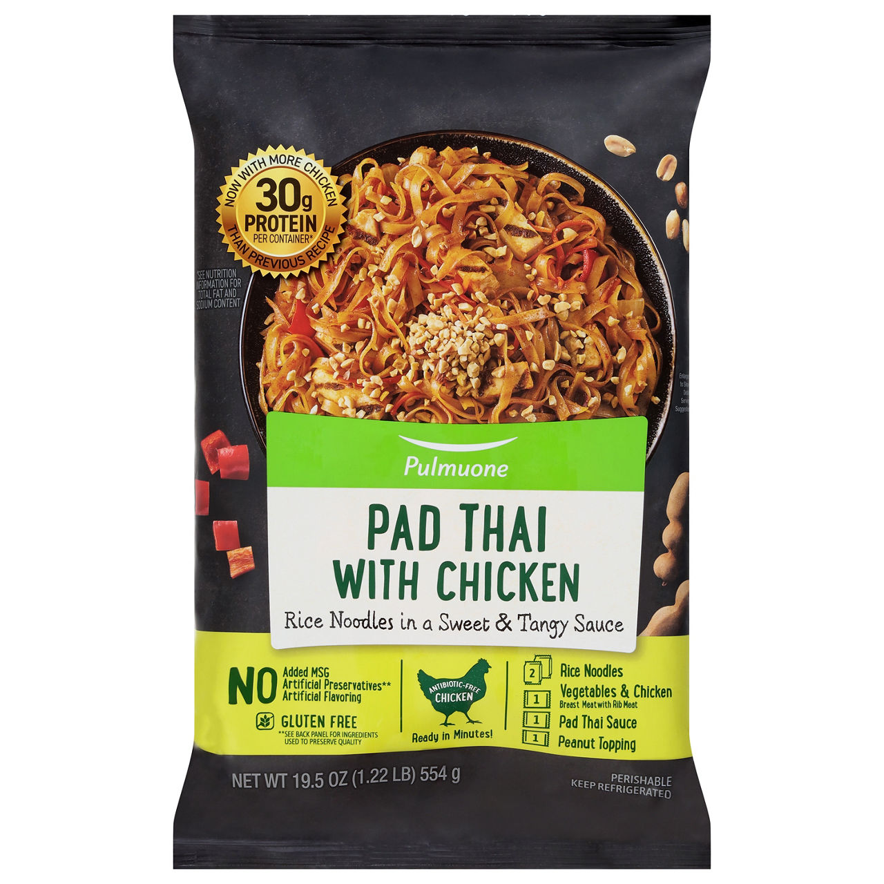 Boneless white chicken, rice noodles, red bell peppers, bean sprouts, & carrots in pad thai sauce