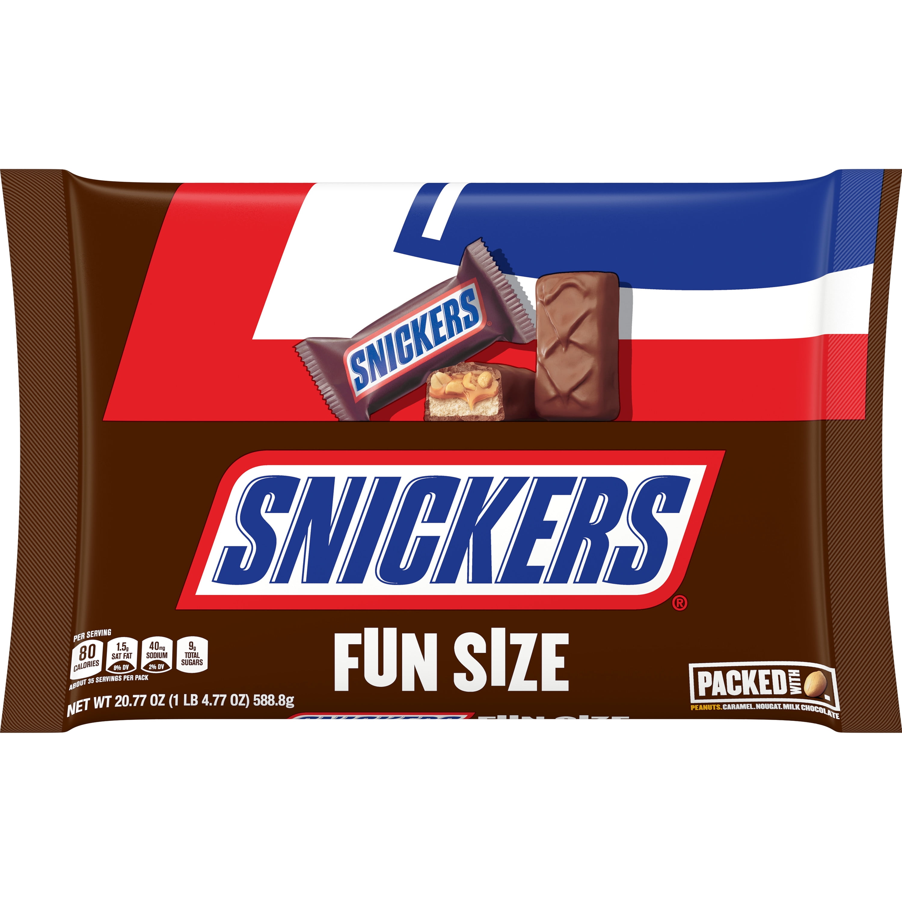 Contains one (1) 20.77-ounce bag of Fun Size SNICKERS Chocolate Bars Made with caramel, nougat, peanuts and milk chocolate SNICKERS Fun Size Chocolates are great for piñata candy, candy buffets and fun recipes Enjoy a satisfying chocolate treat on the go with these individually wrapped SNICKERS Candies Fill the office candy bowl or office pantry with everyone's favorite peanut and milk chocolate treat