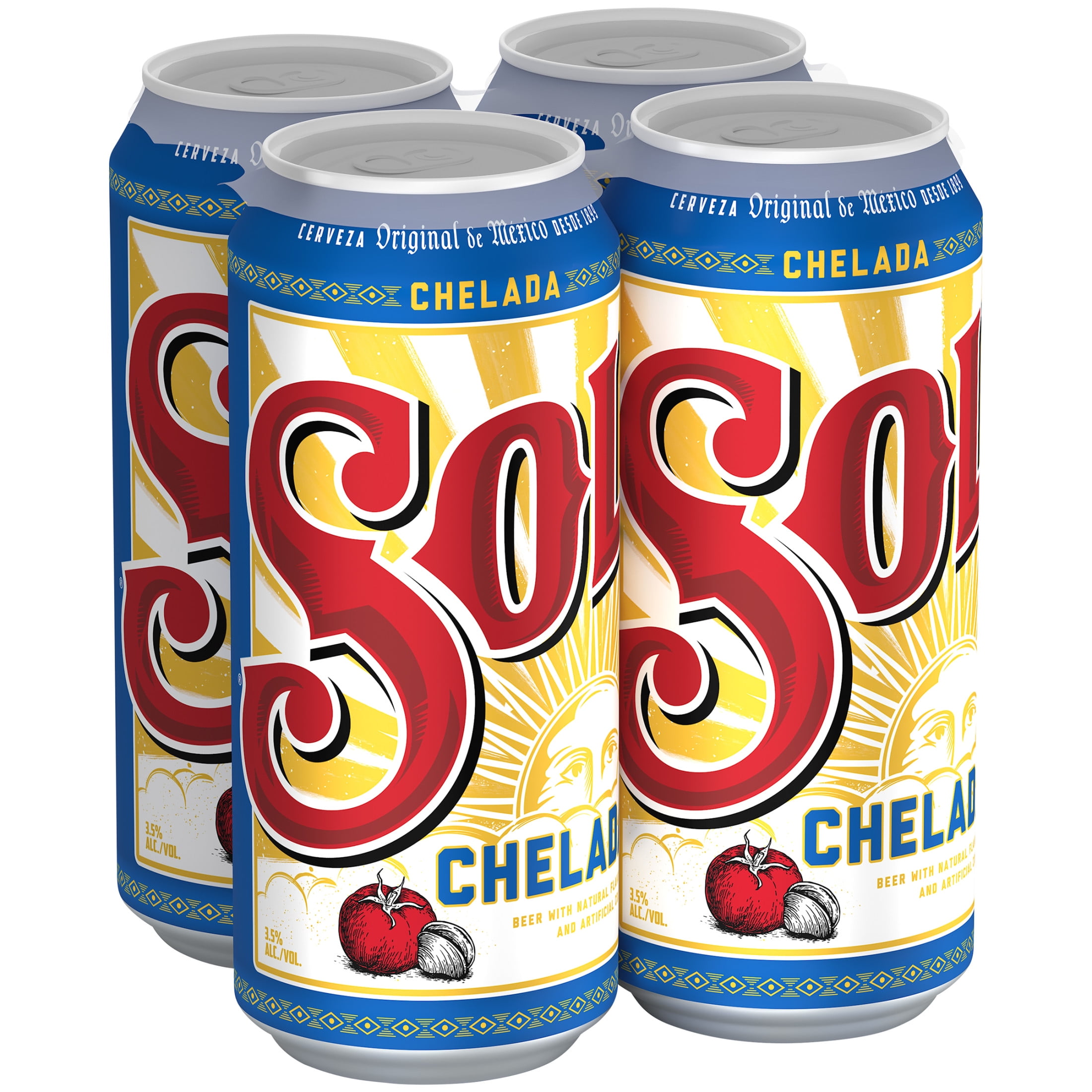 4 pack 16 fl oz cans of Sol Chelada Flavored Mexican Beer A mix of Sol cerveza with tomato, natural lime and spice flavors with 3.5% ABV Delicious ready-to-drink beverage Pairs well with shredded pork stew, chicken cheddar quesadillas, beef tacos and more Premade, no hassle michelada mix that is perfect for daytime social occasions
