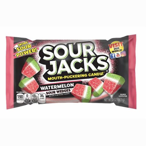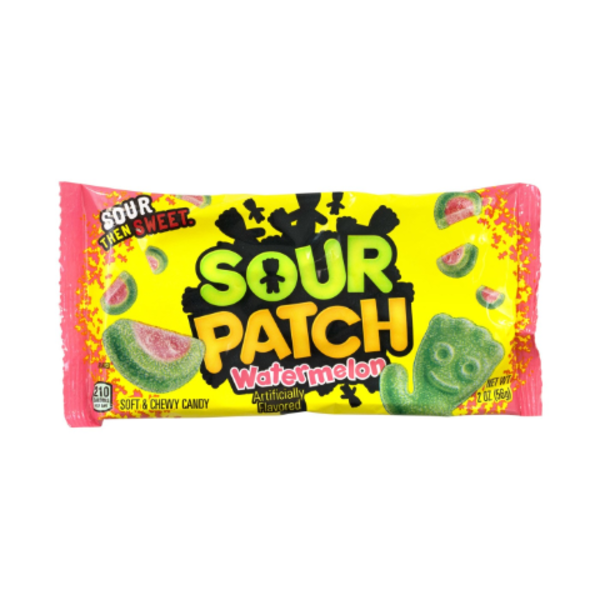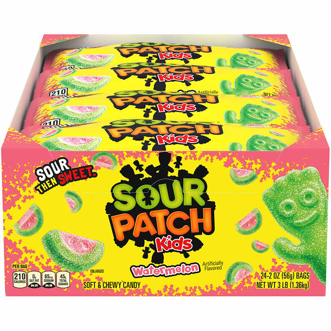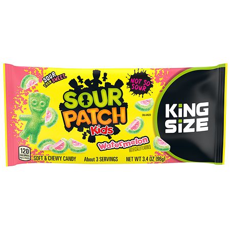 Enjoy a sour twist on your favorite summer flavor with SOUR PATCH KIDS Watermelon Soft & Chewy Candy. Intense watermelon flavor fills each SOUR THEN SWEET candy for a summery blast to your taste buds, and they're shaped like watermelon slices to add excitement to your candy snacking experience. A fat free food, this pink and green candy is the perfect sweet end to your day. Keep these sour gummy snacks on hand for a quick sour treat or as party favors for Halloween, Valentine's Day or birthdays....