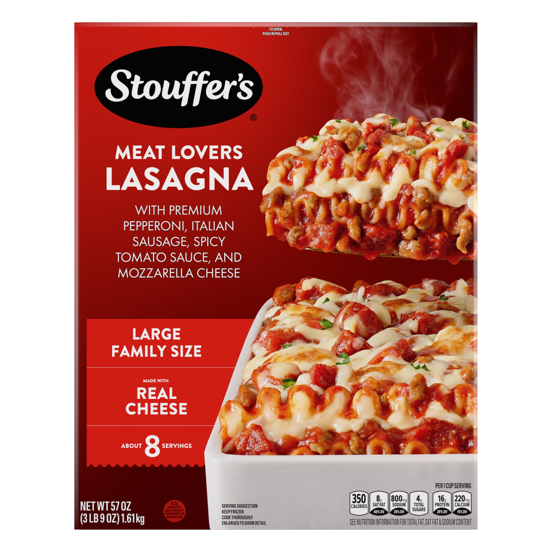 COOKED PASTA (WATER, SEMOLINA WHEAT FLOUR), TOMATO PUREE (WATER, TOMATO PASTE), WATER, COOKED ITALIAN SAUSAGE (PORK, WATER, SPICES, SALT, SUGAR, GARLIC POWDER, SPICE EXTRACTS), PART-SKIM MOZZARELLA CHEESE AND MODIFIED CORNSTARCH (PART-SKIM MOZZARELLA CHEESE [CULTURED MILK, SALT, ENZYMES], MODIFIED CORNSTARCH, SKIM MILK, FLAVORS), PEPPERONI (PORK, BEEF, SALT, 2% OR LESS OF SPICES, DEXTROSE, LACTIC ACID STARTER CULTURE, OLEORESIN OF PAPRIKA, SODIUM ASCORBATE, FLAVORING, SODIUM NITRITE, BHA, BHT, CITRIC ACID), LOW-MOISTURE PART-SKIM MOZZARELLA CHEESE (CULTURED PART-SKIM MILK, SALT, ENZYMES), 2% OR LESS OF MODIFIED FOOD STARCH, SOY SAUCE (WATER, SOYBEANS, WHEAT, SALT), WHEAT FLOUR, DRIED ONIONS, SUGAR, PARMESAN CHEESE (CULTURED MILK, SALT, ENZYMES), SPICES, POTASSIUM CHLORIDE, SALT, GARLIC POWDER.