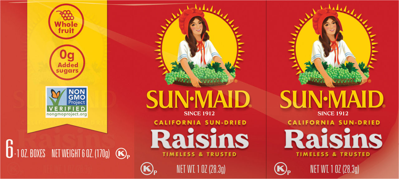 "Made with nothing but grapes and California sunshine, Sun-MaidÃÂî Raisins' timeless and trusted goodness has been a classically delicious dried fruit snack for kids and grown-up kids alike since 1912. Our process has never changed, and neither have our delicious California Sun-Dried Raisins - just simple, whole fruit and Non-GMO goodness, dried by the sun.