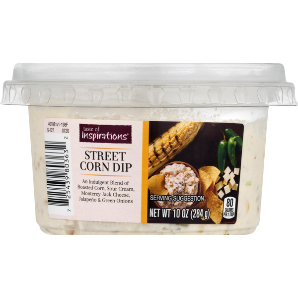 Roasted Corn, Sour Cream (Cultured Cream, Nonfat Dry Milk, Gelatin), Mayonnaise (Soybean Oil, Water, Distilled Vinegar, Egg Yolks, Whole Eggs, Sugar, Salt, Spices, Citric Acid, Lemon Juice Concentrate), Neufchatel Cheese (Pasteurized Milk & Cream, Cheese Culture, Salt, Carob Bean Gum), Monterey Jack Cheese (Pasteurized Milk, Cheese Cultures, Salt, Enzymes, Natamycin [Natural Mold Inhibitor]), Parmesan Cheese (Milk, Rennet, Salt), Green Onion, Jalapenos (Jalapeno Peppers, Water, Salt, Citric Acid, Sodium Benzoate [Maintains Freshness], Calcium Chloride), Salt, Modified Corn Starch, Spices, Natural Flavor, Sodium Benzoate & Potassium Sorbate (Maintains Freshness).