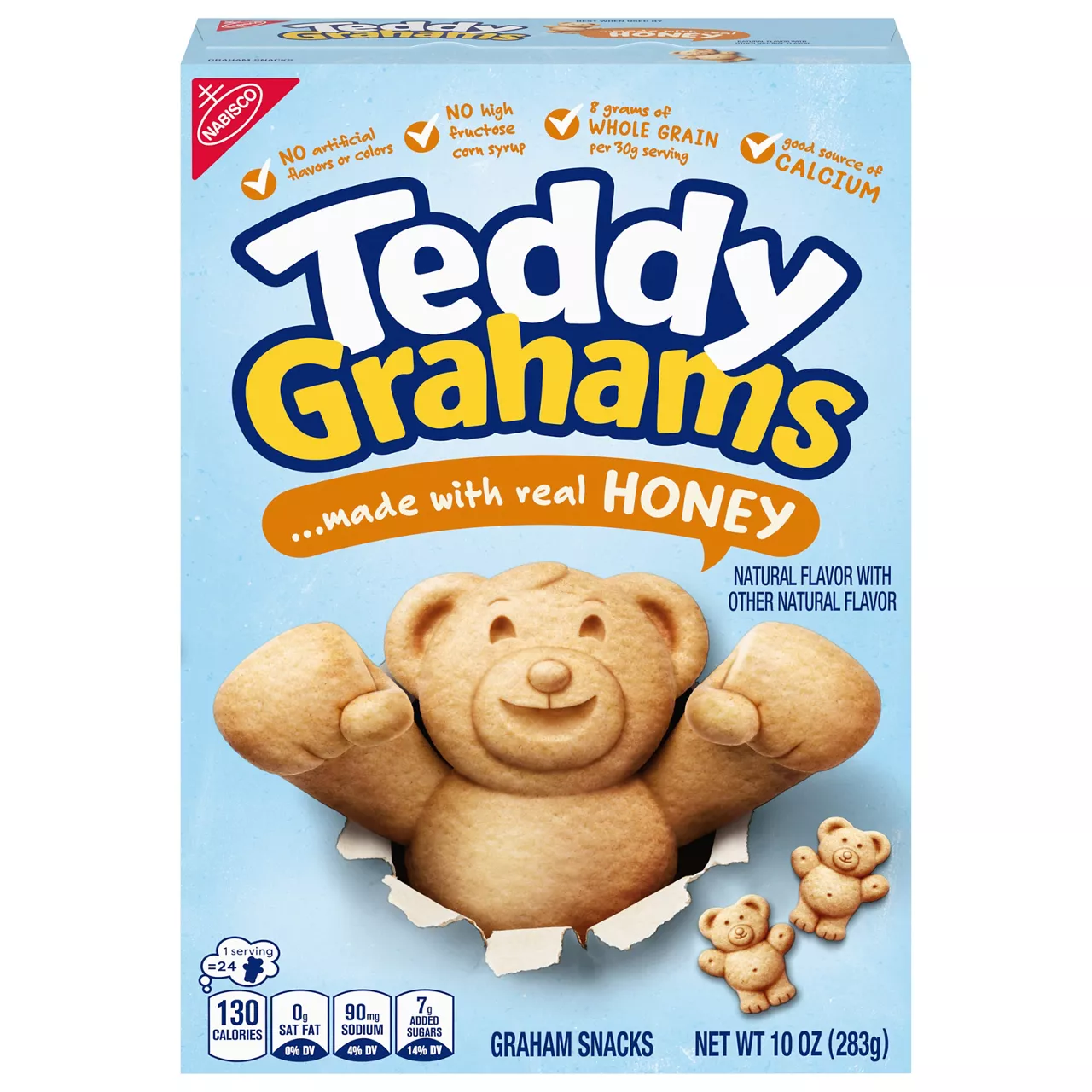 Teddy Grahams Honey Graham Snacks are lovable, bear-shaped crunchy snacks that are deliciously baked and made with real honey. With no artificial colors or flavors, no high fructose corn syrup and 8 grams of whole grain per serving, these honey grahams are a wholesome snack for the entire family.