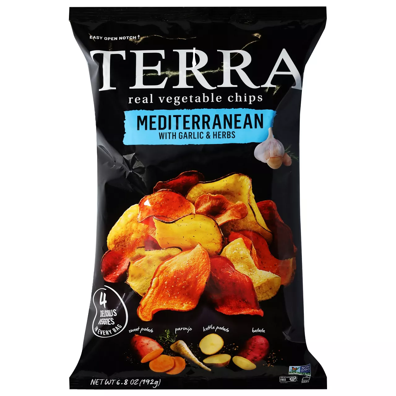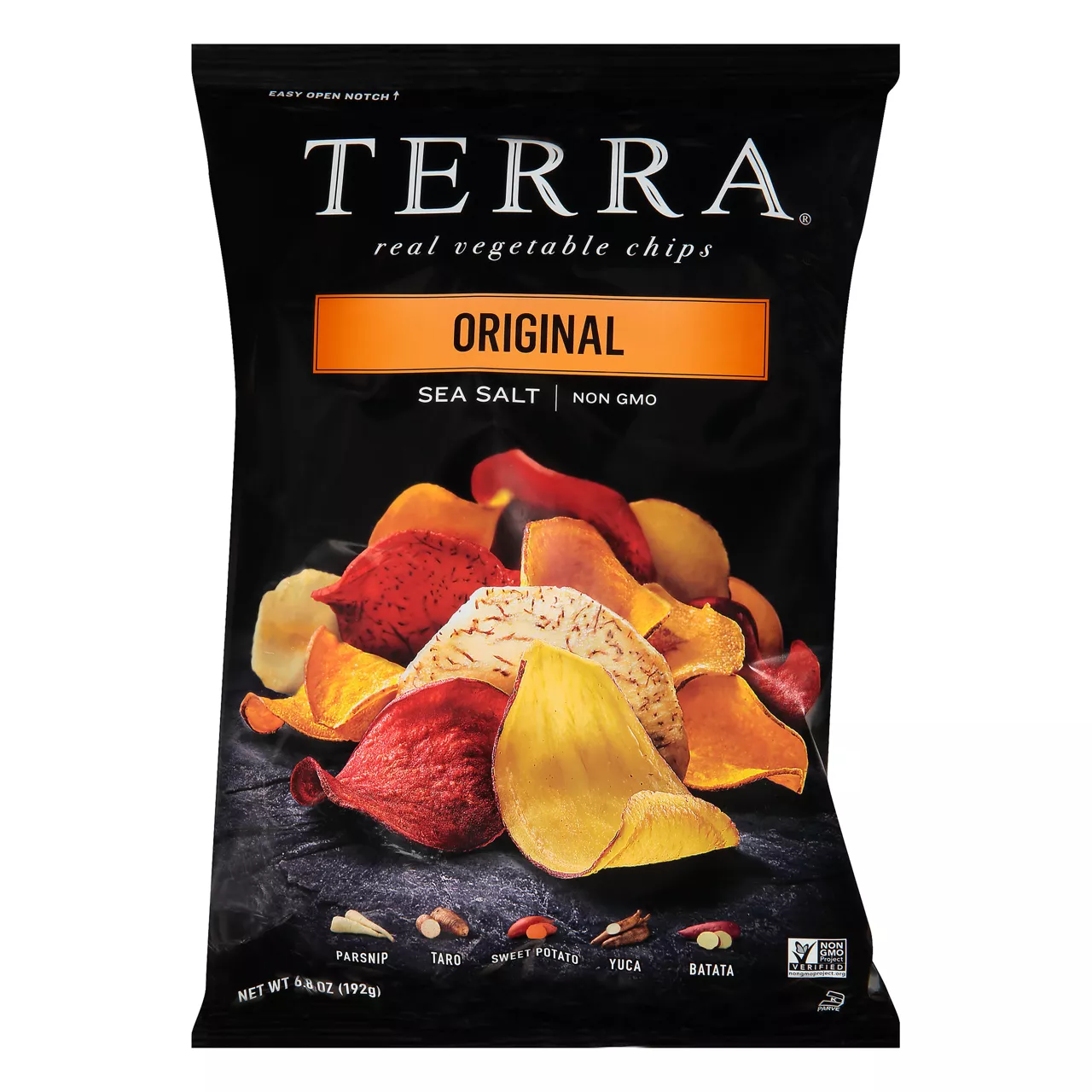 Open up a bag of TERRA Exotic Potato Chips with Sea Salt for a unique and sophisticated snacking experience. This chip blend features yukon gold, sweet and naturally blue potatoes combined with beet-dipped sweet potatoes to impart a bright, ruby-red hue. As colorful as they are delicious, our chips are made with real, non-GMO vegetables for a snack that's vegan and gluten-free. You can snack without guilt because our chips contain 0mg of cholesterol and 0g of trans fat and no artificial flavors or...