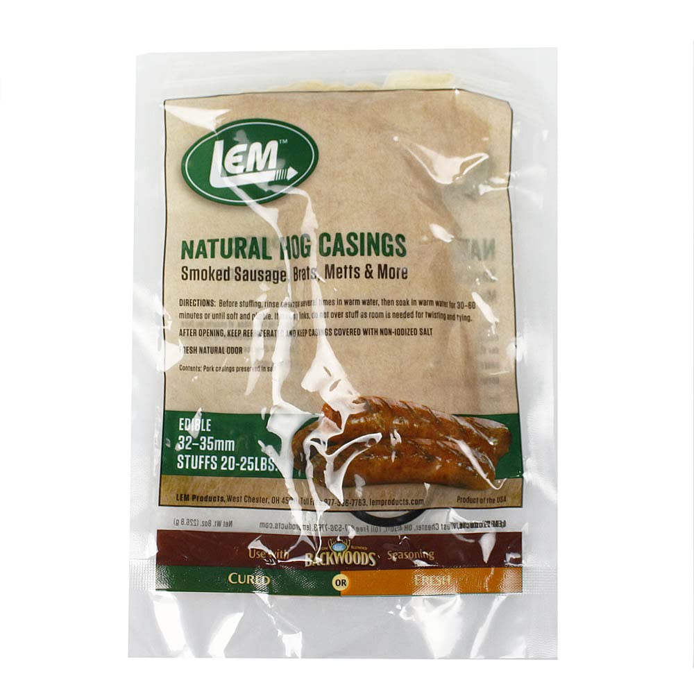 Perfect for small batch snack stick, hot dog, or breakfast sausage home sausage making. Stuffs approximately 15lbs of sausage depending on stuffing style (link lengths or rope stuffing). Our Home Packs are composed of the same high quality natural sheep casings that we sell to processors across that country, these are just in varying diameters ranging from 20-26mm and varying lengths called “shorts”. Contains 1 package. Dimensions: 5" L, 1" W, 7" H. Packaged in purified salt to ensure freshness and indefinite shelf life when properly refrigerated