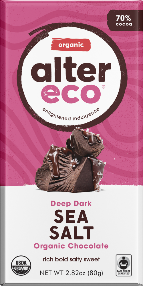 THEO DARK CHOCOLATE AND SEA SALT BARS ARE VEGAN, NON-GMO, ORGANIC AND DAIRY KOSHER. MADE WITH 99% CERTIFIED FAIR TRADE INGREDIENTS, DARK CHOCOLATE AND SEA SALT BARS FEATURE COCOA BEANS, CANE SUGAR AND SEA SALT. EACH HALF-BAR SERVING CONTAINS 4 GRAMS OF PROTEIN, 3 GRAMS OF FIBER, 0 TRANS FATS AND JUST 200 CALORIES. THEO CHOCOLATE IS MADE WITHOUT USING PALM OR SOY. SEE NUTRITION FACTS PANEL FOR ALLERGENS.