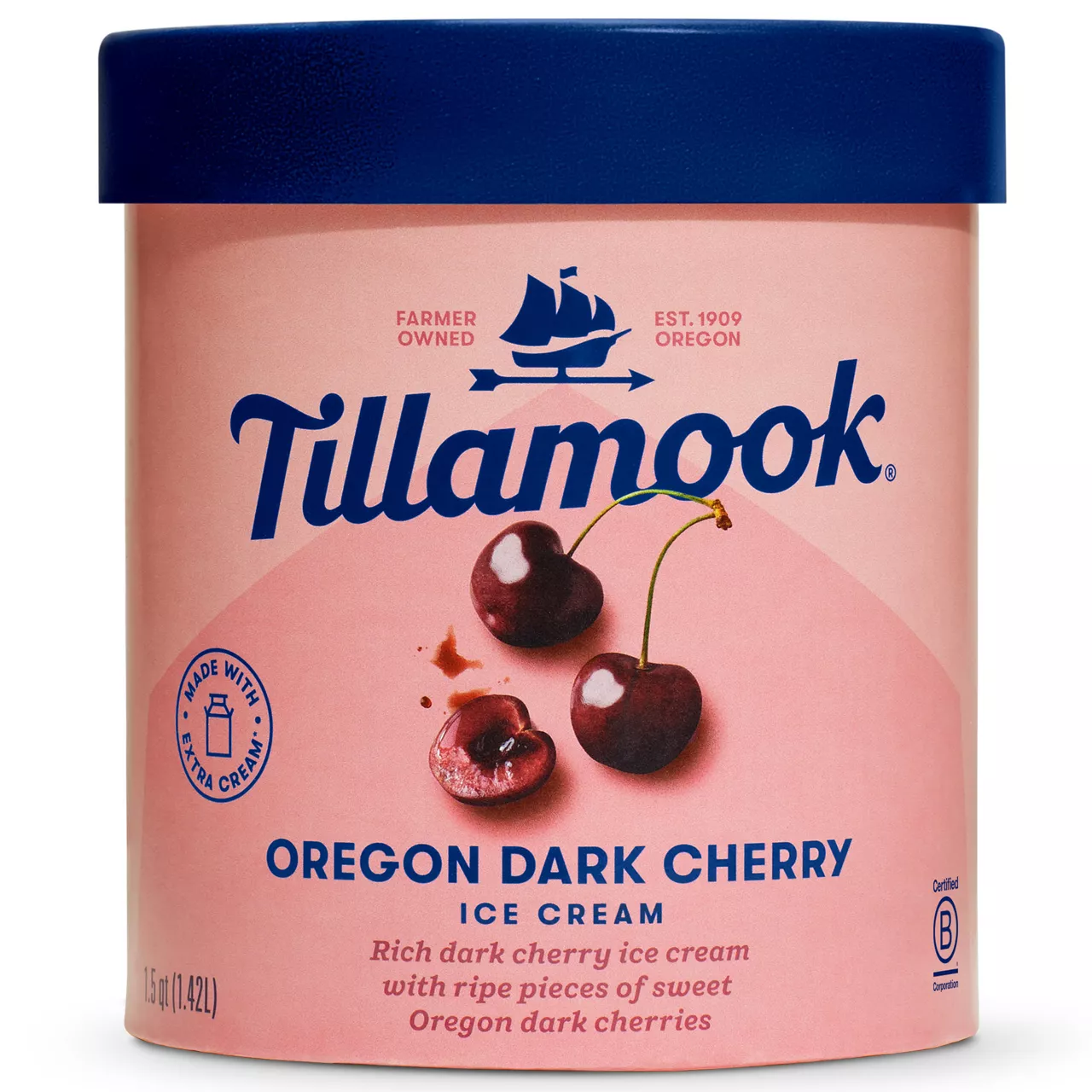 Rich dark cherry ice cream with ripe pieces of sweet Oregon dark cherries. Same great taste! Farmer owned. Est. 1909 Oregon. Made with extra cream (Tillamook ice cream is made with more cream that is legally required). From cows not treated with rbST (all farmers who supply milk for Tillamook products pledge not to use artificial growth hormones. The FDA has stated that no significant difference has been shown between milk derived from rBST treated and non-rBST treated cows). Really creamy ice cream....