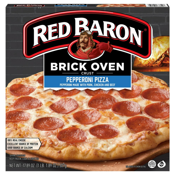 Ingredients: Enriched Flour (wheat flour, niacin, ferrous sulfate, thiamin mononitrate, riboflavin, folic acid), Water, Imitation Mozzarella Cheese (water, vegetable oil, modified food starch, potato starch, gelatin, rennet casein, modified whey. Contains less than 2% of: citric acid, potassium chloride, potassium sorbate [preservative], salt, sodium aluminum phosphate, sodium citrate, sodium phosphate, titanium dioxide [artificial color]), Tomato Puree (water, tomato paste), Pepperoni Seasoned Pork, Chicken, and Beef Pizza Topping (pork, mechanically separated chicken, water, soy protein concentrate, salt, contains 2% or less of: pepperoni [pork, mechanically separated chicken, beef, salt, contains 2% or less of: spices, dextrose, pork stock, lactic acid starter culture, oleoresin of paprika, flavoring, sodium ascorbate, sodium nitrite, BHA, BHT, citric acid], spices, dextrose, oleoresin of paprika, sodium ascorbate, garlic powder, natural flavors, maltodextrin, sodium nitrite, lactic acid starter culture, BHA, BHT, citric acid), Vegetable Oil, Rehydrated Mozzarella Cheese (water, part skim milk, salt, cultures, enzymes). Contains less than 2% of: Modified Food Starch, Yeast, Sugar, Salt, Defatted Soy Flour, Dextrose, Spice, Monocalcium Phosphate, Baking Soda, Citric Acid, Malic Acid, Xanthan Gum, Maltodextrin, Annatto Extract (color), L-Cysteine Hydrochloride (dough conditioner), TBHQ (preservative), Natural Flavor.
