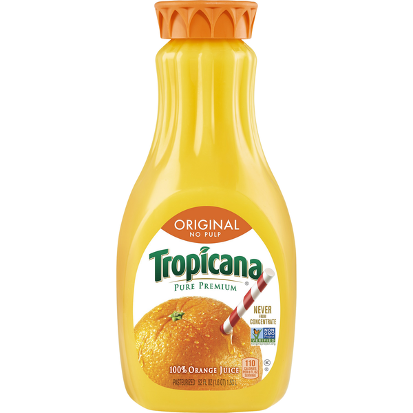 Tropicana Pure Premium Non GMO, Original No Pulp Orange Fruit Juice, The perfect combination of taste and nutrition! Tropicana Pure Premium Pure Premium Original is 100% pure Florida orange juice, squeezed from fresh-picked oranges and never from concentrate. No wonder it's the #1 orange juice brand. Grab and Go. Great for On-The-Go. Never from concentrate. 100% orange juice that's squeezed from fresh oranges. No added sugar, water, or preservatives. Kosher. Caffeine Free. Smooth Texture.