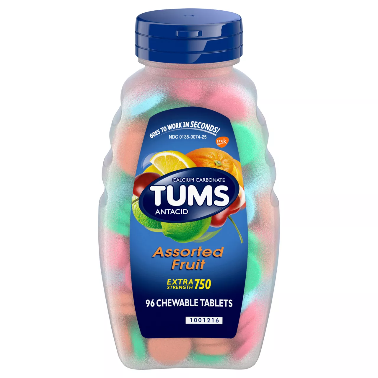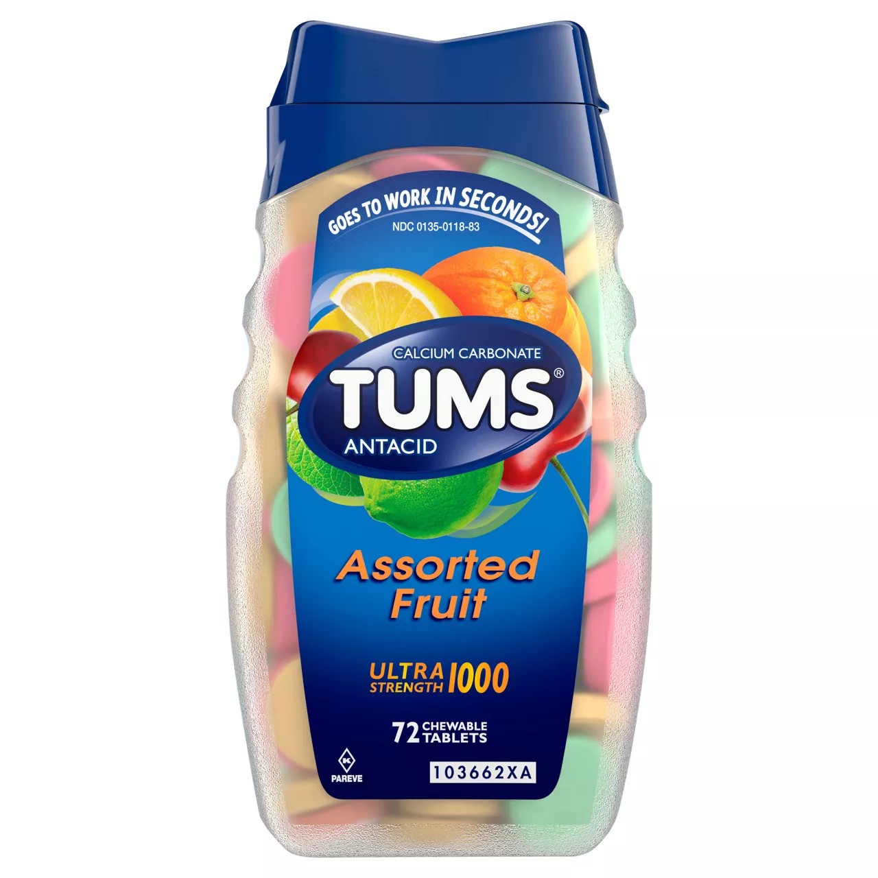 TUMS Chewy Bites Assorted Berries antacids have fast-acting, extra strength heartburn relief. TUMS antacid chews relieve heartburn, sour stomach, acid indigestion, and upset stomach associated with these symptoms, so you can have it all, without the worry. Many other heartburn medications are absorbed into the bloodstream and can take hours or days to fully work. TUMS heartburn medicine goes to work in seconds, traveling directly to the source of the heartburn. Once there, it neutralizes acid on...