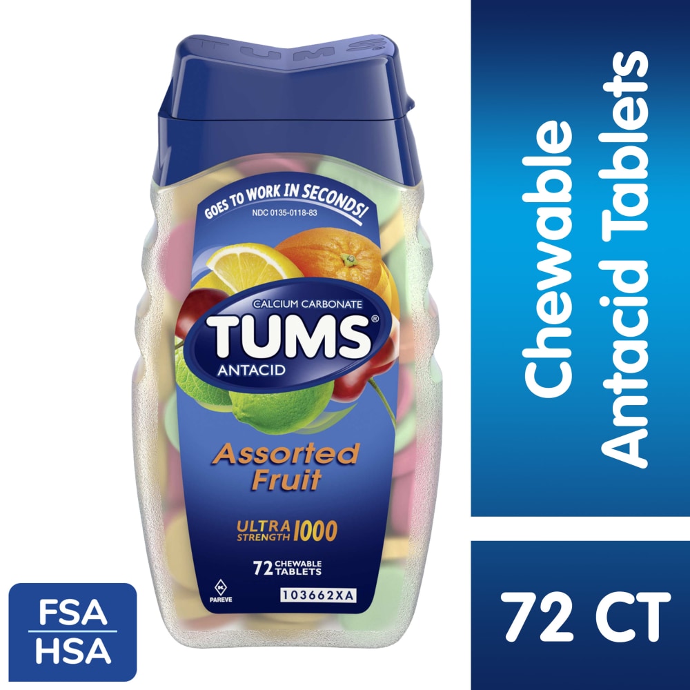 TUMS Ultra Strength Assorted Berries chewable antacids have fast-acting, ultra strength relief. TUMS antacid tablets relieve heartburn, sour stomach, acid indigestion, and upset stomach associated with these symptoms, so you can have it all, without the worry. Many other heartburn medications are absorbed into the bloodstream and can take hours or days to fully work. TUMS heartburn medicine goes to work in seconds, traveling directly to the source of the heartburn. Once there, it neutralizes acid...