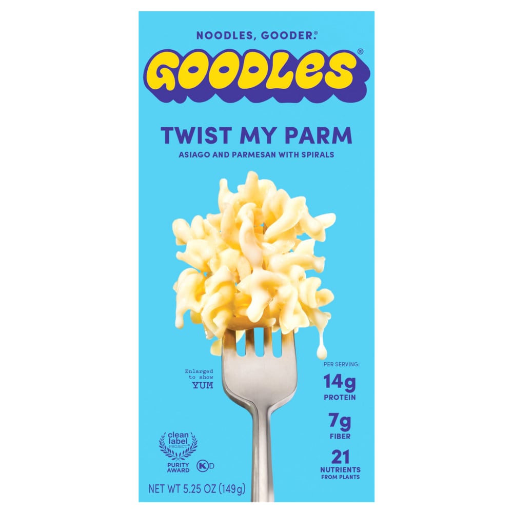 Goodles Noodles (Wheat Flour, Chickpea Protein, Wheat Protein, Nutrients Extracted from [Broccoli, Spinach, Kale, Pumpkin, Sweet Potato, Sunflower Seed, Cranberry, Chlorella, Maitake Mushroom, Shiitake Mushroom]), Asiago and Parmesan Cheese Blend (Cultured Milk, Whey, Salt, Disodium Phosphate, Enzymes), Butter (Cream, Salt, Enzymes), Buttermilk, Salt, Tapioca Flour.