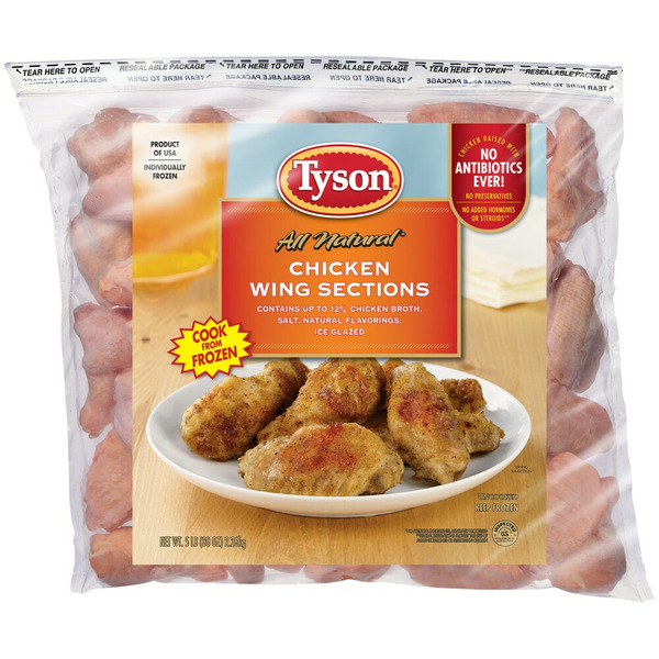 Tyson® all natural chicken wing sections. 5 lb bag. Ice glazed. Contains up to 12% natural* chicken broth tenderness & juiciness guaranteed*. Inspected for wholesomeness by u.s. Department of agriculture. *no artificial ingredients, minimally preserves product.