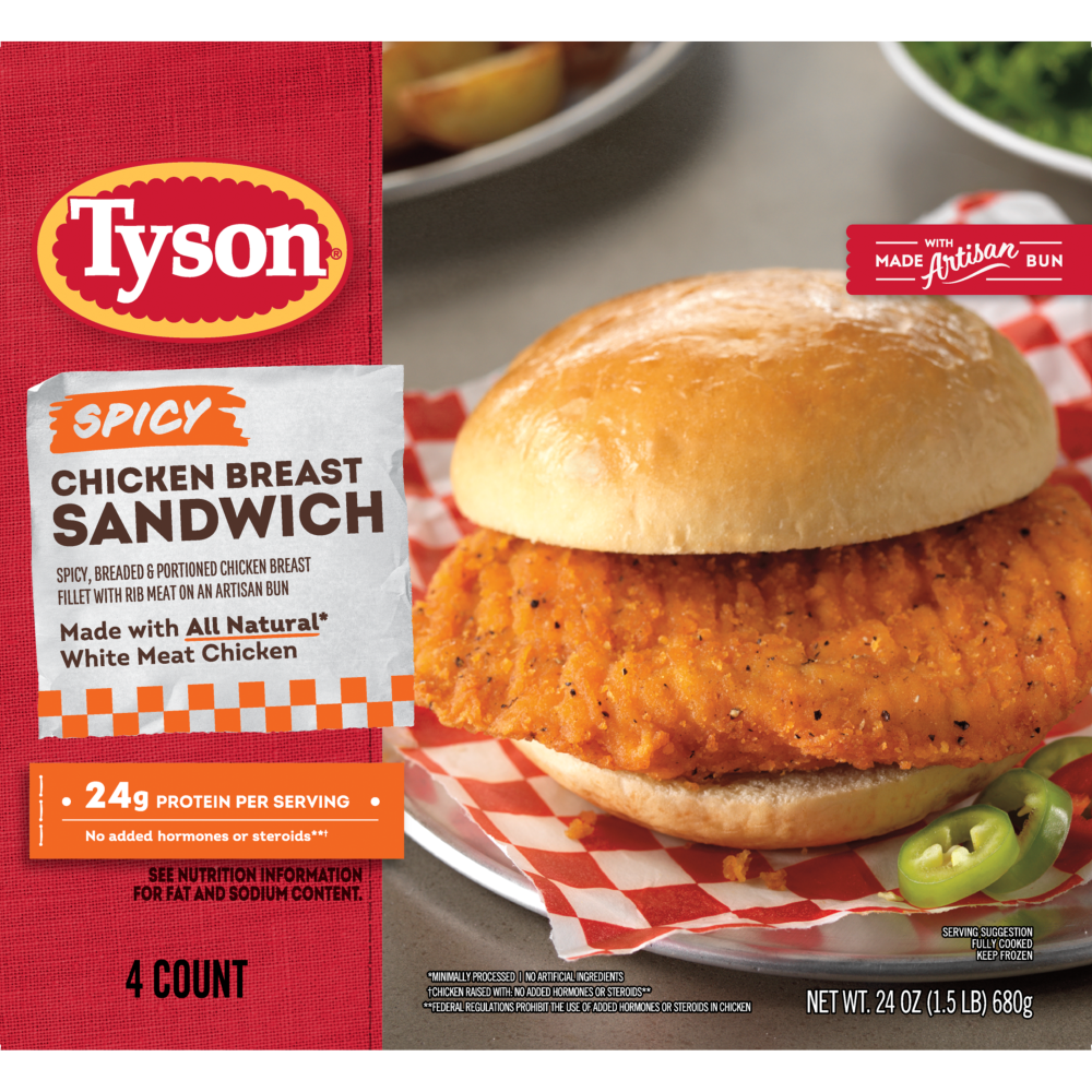 Tyson® Chicken Breast Sandwiches are a line of high-quality chicken sandwiches made with All-Natural chicken. We start with a tender, juicy, Tyson chicken breast fillet and set it in a perfectly seasoned marinade. Then we batter and bread the fillet for a golden-brown finish and place on a warm artisan bun.