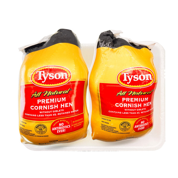 There's nothing like cooking from scratch, especially when you start with a Tyson All Natural* Premium Chicken Whole Cornish Hens Twin Pack. With no added preservatives, our all natural* chicken is juicy and tender with 19g of protein and 0g of trans fat per serving. Perfect for grilling and roasting, baste our whole Cornish hens with melted butter for a delicious meal entree. When roasting, season with sage or poultry seasoning. Prep is as easy as cooking chicken in the oven and serving with veggies...