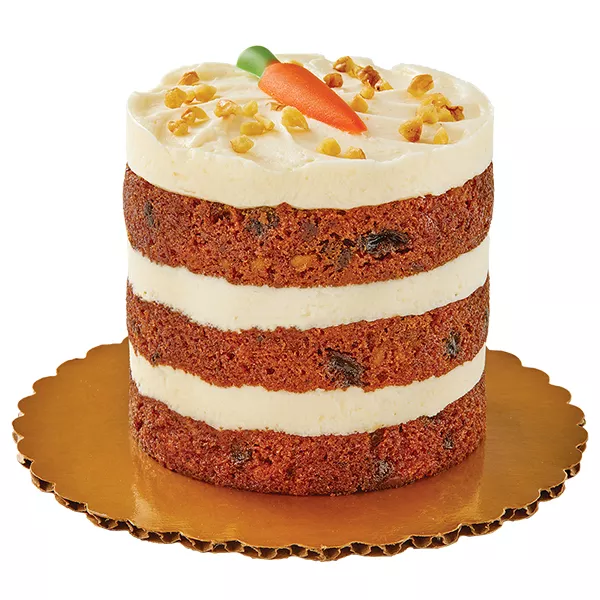 <strong>Ingredients: </strong>CAKE: <strong>Carrots, Sugar, Cream Cheese</strong> (Milk Fat, Nonfat Milk, Bacterial Culture, Salt, Guar Gum, Locust Bean Gum), <strong>Enriched Wheat Flour</strong> (Wheat Flour, Niacin, Reduced Iron, Thiamin Mononitrate, Riboflavin, Folic Acid), <strong>Icing Sugar</strong> (Sugar, Corn Starch),<strong> Eggs, Canola Oil, Soybean Oil, Raisins, Butter</strong> (Cream), <strong>Walnuts, Vegan Margarine </strong>(Palm Oil, Canola Oil, Water, Vegetable Monoglycerides, Natural Flavor, Citric Acid, Vitamin A Palmitate, Vitamin D2), <strong>Barley Malt Extract, Salt, Cinnamon, Baking Soda, Nutmeg, Natural Flavor. </strong>TOPPINGS: <strong>Walnuts. </strong>May inlude: <strong>Carrot Decor </strong>(Sugar Cane, Cocoa Butter, Whole Milk Powder, Nonfat Dry Milk, Soy Lecithin-an emulsifier, Paprika Oleoresin, Turmeric Oleoresin, Spirulina, Natural Vanilla Extract).