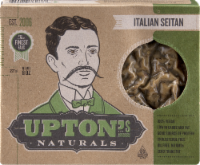 Seitan, Italian, Box 8 OZ 100% vegan. Good source of protein. Zero: oil, trans fat, & cholesterol. Low in carbs & fat. Non GMO Project verified. nongmoproject.org. Easily Make These Dishes: pizza; pasta; over rice; breakfast. When in Chicago, visit our factory cafe. This package is compostable and made with 100% recycled materials. Try our six great seitan styles. Visit Uptonsnaturals.com to find out more. Keep refrigerated or frozen. Heat and serve. Enjoy within five days of opening. Can be baked...