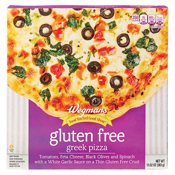 Crust (Heavy Whipping Cream, White Rice Flour, Corn Starch, Whole Milk, Tapioca Starch, Potato Starch, Water, Extra Virgin Olive Oil, Yeast, Sugar, Egg Yolk Powder, Guar Gum, Sea Salt, Honey, White Pepper), Cheese Blend (Low Moisture Part-Skim Mozzarella Cheese [Pasteurized Part Skim Milk, Cheese Cultures, Salt, Enzymes], White Cheddar Cheese [Pasteurized Milk, Cheese Cultures, Salt, Enzymes]), Sauce (Water, Cream [Cream, Carrageenan], Parmesan Cheese [Pasteurized Part Skim Milk, Cheese Cultures, Salt, Enzymes], CornStarch, Soybean Oil, Butter, Salt, Sugar, Spices, Dehydrated Garlic, Xanthan Gum), Tomatoes, Feta Cheese (Pasteurized Milk, Cultures, Salt, Enzymes), Black Olives (Ripe Olives, Salt, Ferrous Gluconate), Spinach, Garlic.