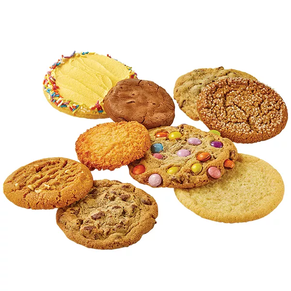 <strong>Ingredients: </strong>COOKIES<strong>: Enriched Wheat Flour </strong>([Wheat Flour, Niacin, Reduced Iron, Thiamine Mononitrate, Riboflavin, Folic Acid], Malted Barley Flour),<strong> Butter </strong>(Cream, Natural Flavor)<strong>, Wheat Pastry Flour, Sugar, Egg, Almonds, Sugared Egg Yolk </strong>(Egg Yolks, Sugar),<strong> Hazelnuts, 2% or less of each of the following: Sour Cream</strong> (Cream, Skim Milk, Vitamin A Palmitate), <strong>Wheat Flour, Palm & Palm Kernel Oil, Powdered Sugar </strong>(Sugar, Cornstarch),<strong> Cocoa </strong>(alkalized),<strong> Natural Flavors, Apricot </strong>(Apricot Puree Concentrate, Cane Sugar Syrup, Glucose Syrup, Diced Apricots, Corn Starch, Citric Acid, Natural Flavor, Vegetable Gums, Color),<strong> Raspberries </strong>(Sugar, Fruit Pectin, Natural Raspberry Flavor, Malic Acid),<strong> Walnuts, Water, Cornstarch, Salt, Cinnamon, Soy Lecithin</strong> (emulsifier),<strong> Sunflower Lecithin </strong>(emulsifier),<strong> Colors</strong> (Vegetable Juice),<strong> Maltodextrin, Carnauba Wax, Cellulose Gum.</strong> MAY BE TOPPED WITH ONE OF MORE OF THE FOLLOWING:<strong> Colored Icing </strong>(Sugar, Butter, Nonfat Milk, Cornstarch, Natural Flavor, Whey, Water, Coloring [Fruit & Vegetable Juice, Spirulina, Beta Carotene, Caramel Color, Lycopene, Paprika Oleoresin, Riboflavin]), <strong>Chocolate Icing</strong> (Sugar, Butter, Water, Cocoa [alkalized], Cornstarch), <strong>Sprinkles</strong> (Sugar, Palm Kernel & Palm Oil, Cornstarch, Sunflower Lecithin, Coloring [Spirulina, Turmeric, Annatto, Vegetable Juice, Paprika, Beta Carotene, Cocoa [alkalized], Maltodextrin, Carnauba Wax, Cellulose Gum)<strong>, Colored Sugar </strong>(Sugar, Coloring [Vegetable Juice, Annatto, Red Cabbage, Beet, Turmeric Oleoresin], Carnauba Wax).