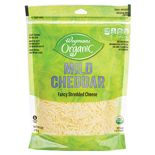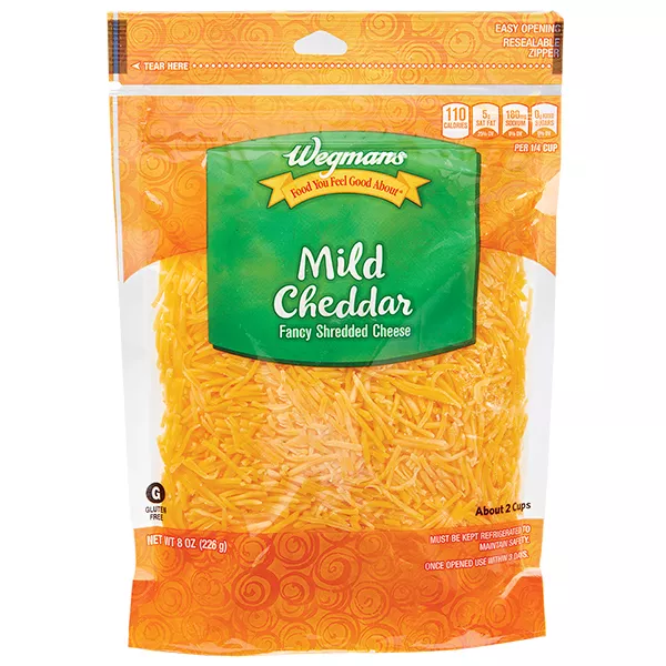 1/3 less fat than Regular Mild Cheddar Cheese*. About 2 cups. Non-Animal Rennet. Our Food You Feel Good About yellow banner is your shortcut to great-tasting products with no artificial colors, flavors or preservatives. *Fat has been reduced from 9g to 6g per serving.