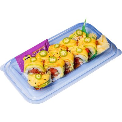 - - *MADE WITH NO GLUTEN-CONTAINING INGREDIENTS - - Keep Refrigerated. - - Ingredients: Water, Rice, Tuna, Avocado, Cucumber, Sugar, Seaweed, Sesame Seeds, Rice Vinegar, Salt, Distilled Vinegar, Glucono Delta Lactone, Yeast Extract. Also Contains: Gluten Free Soy Sauce, Wasabi and Ginger. CAUTION: May Contain Bone Fragments.