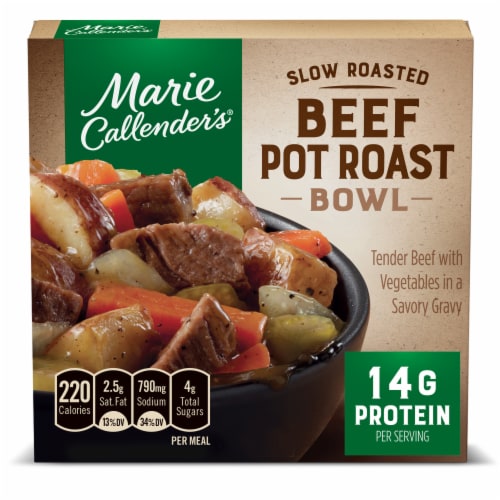 COOKED SEASONED BEEF POT ROAST DICES AND BINDER PRODUCT (BEEF, BEEF BROTH, MODIFIED FOOD STARCH, SOYBEAN OIL, SALT, DEXTROSE, SODIUM PHOSPHATE, CARAMELIZED SUGAR, SPICE EXTRACTIVES), SAUCE (WATER, MODIFIED FOOD STARCH, TOMATO PUREE [TOMATO PASTE, WATER], BURGUNDY WINE, REDUCED SODIUM SOY SAUCE [WATER, WHEAT, SOYBEANS, SALT, ALCOHOL, VINEGAR, LACTIC ACID], NATURAL FLAVOR, ROASTED BEEF WITH BEEF BROTH, SALT, RED WINE VINEGAR, YEAST EXTRACT, DEHYDRATED GARLIC, SPICES, XANTHAN GUM, CANE SYRUP SOLIDS, MALTODEXTRIN, BARLEY MALT EXTRACT, DEHYDRATED ONION, POTATO FLOUR), CARROTS, ROASTED RED POTATOES, GREEN BEANS, ONIONS.