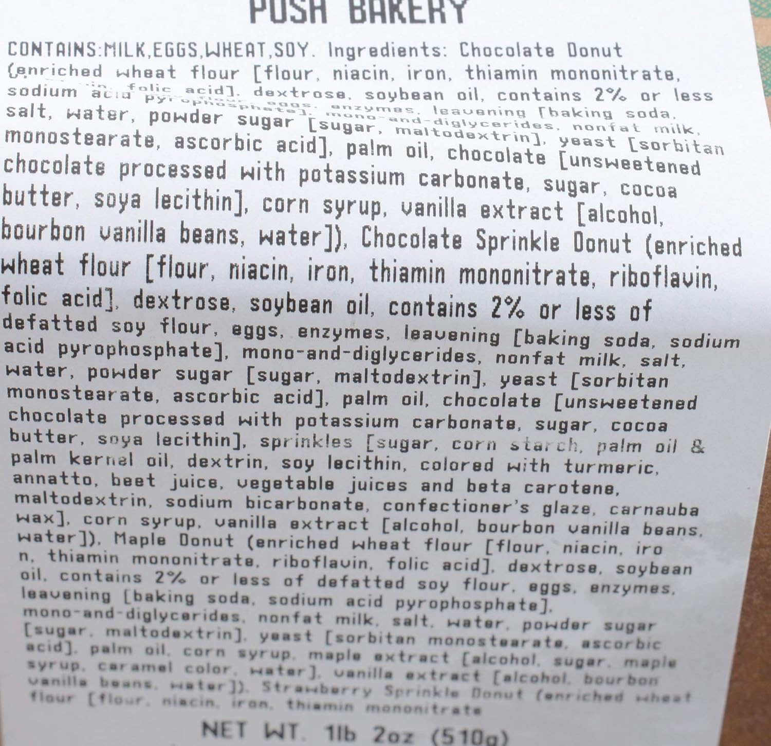 Chocolate Donut (enriched wheat flour [flour, niacin, iron, thiamin mononitrate, sodium acid pyrophosphate, folic acid], dextrose, soybean oil, contains 2% or less salt, water, powder sugar [sugar, maltodextrin], nonfat milk, monostearate, ascorbic acid, palm oil, chocolate [unsweetened chocolate processed with potassium carbonate, sugar, cocoa butter, soya lecithin], corn syrup, vanilla extract [alcohol, bourbon vanilla beans, water]), Chocolate Sprinkle Donut (enriched wheat flour [flour, niacin, iron, thiamin mononitrate, riboflavin, folic acid], dextrose, soybean oil, contains 2% or less of defatted soy flour, eggs, enzymes, leavening [baking soda, sodium acid pyrophosphate], mono-and-diglycerides, nonfat milk, salt, water, powder sugar [sugar, maltodextrin], yeast [sorbitan monostearate, ascorbic acid], palm oil, chocolate [unsweetened chocolate processed with potassium carbonate, sugar, cocoa butter, soya lecithin], sprinkles [sugar, corn starch, palm oil & palm kernel oil, dextrin, soy lecithin, colored with turmeric, annatto, beet juice, vegetable juices and beta carotene, maltodextrin, sodium bicarbonate, confectioner's glaze, carnauba wax], corn syrup, vanilla extract [alcohol, bourbon vanilla beans, water]), Maple Donut (enriched wheat flour [flour, niacin, iron, thiamin mononitrate, riboflavin, folic acid], dextrose, soybean oil, contains 2% or less of defatted soy flour, eggs, enzymes, leavening [baking soda, sodium acid pyrophosphate], mono-and-diglycerides, nonfat milk, salt, water, powder sugar [sugar, maltodextrin], yeast [sorbitan monostearate, ascorbic acid], palm oil, corn syrup, maple extract [alcohol, sugar, maple syrup, caramel color, water], vanilla extract [alcohol, bourbon vanilla beans, water]), Strawberry Sprinkle Donut (enriched wheat flour [flour, niacin, iron, thiamin mononitrate