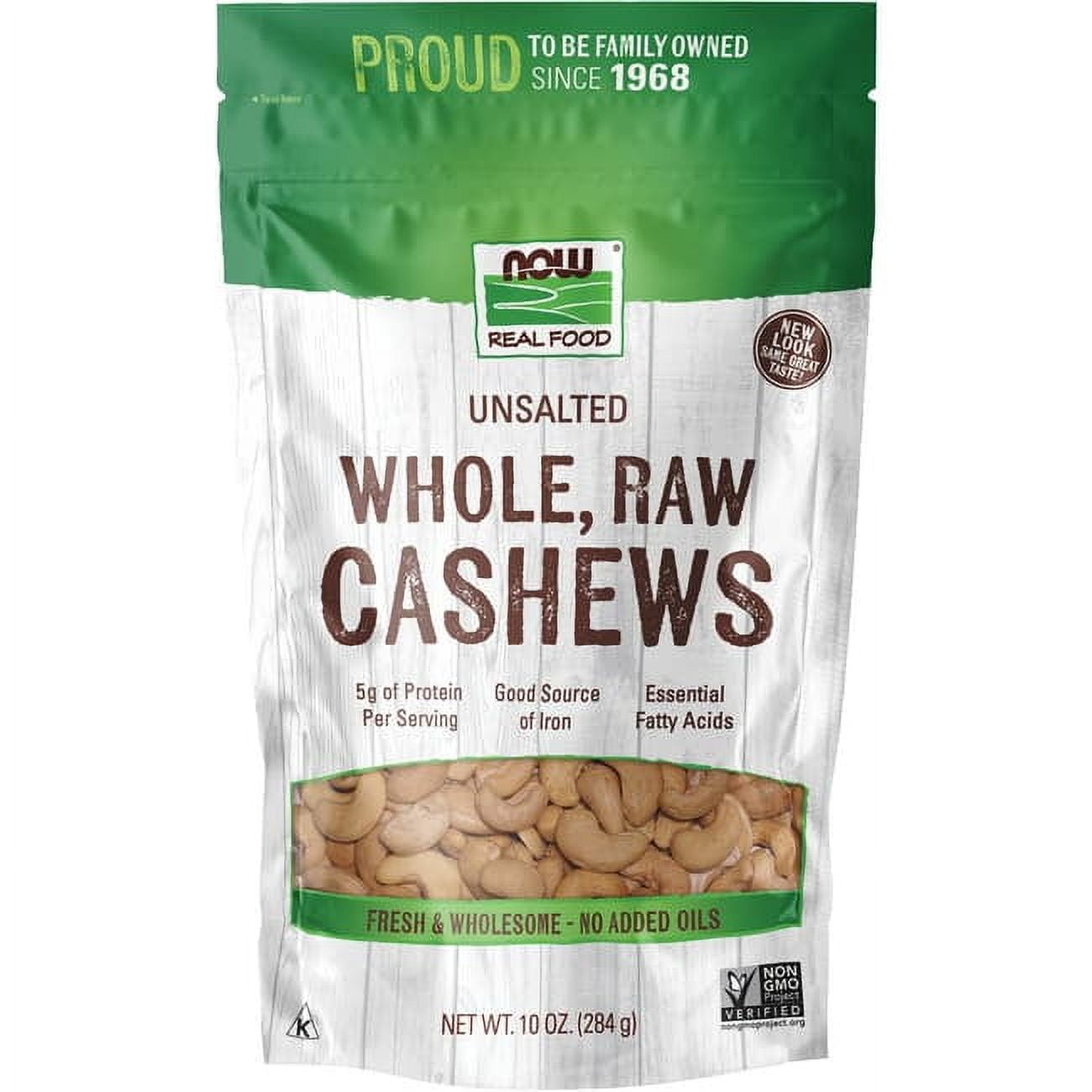 Whole Raw Cashews 10 oz BagProduct DescriptionNOW Real Food Cashews have a rich, buttery, nutty flavor that makes them one of the most enjoyable nuts to eat raw. They're also a great addition to many desserts and appetizers and make a savory crust for chicken and seafood dishes as well. As with most nuts, cashews are a good natural source of protein (up to five grams of protein per ounce). They're also a good source of fiber and iron. Nature's blessings indeed!