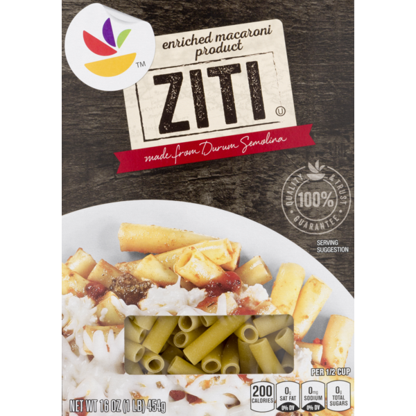 Your family's favorite baked pasta dish will taste even better when you prepare it with a package of Ziti from Good & Gatherâ¢. This pasta comes in a tube shape for a bite that's sure to satisfy, and a slightly coarse texture helps sauces cling for rich flavor bite after bite. Plus, it's made with no artificial flavors, preservatives or synthetic colors. Simply mix with your favorite homemade or prepared red sauce, top with cheese and bake for a tasty dish they'll ask for again and again.