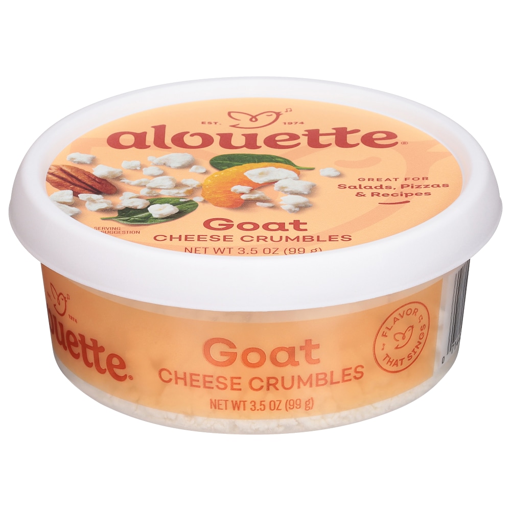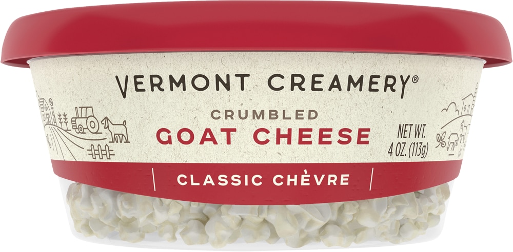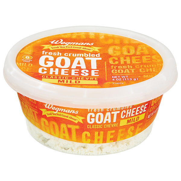 Goat cheese crumbles, also known as chevre, are small broken pieces of soft goat cheese made from goat's milk. This creamy, tangy cheese is a versatile ingredient commonly used in savory and sweet dishes. Goat cheese crumbles have a distinctive earthy flavor, which contrasts nicely with its smooth, velvety texture, and is usually sold in small containers for easy use and storage.