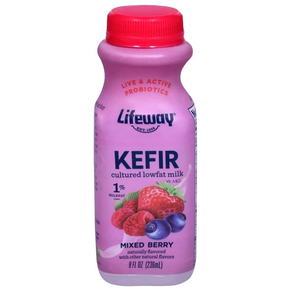 Mixed Berry Kefir is a creamy, fermented drink brimming with beneficial probiotics. Made from a rich blend of milk and kefir grains, this effervescent beverage boasts a tangy flavor highlighted by an assortment of mixed berries, yielding a complex yet refreshing taste sensation.