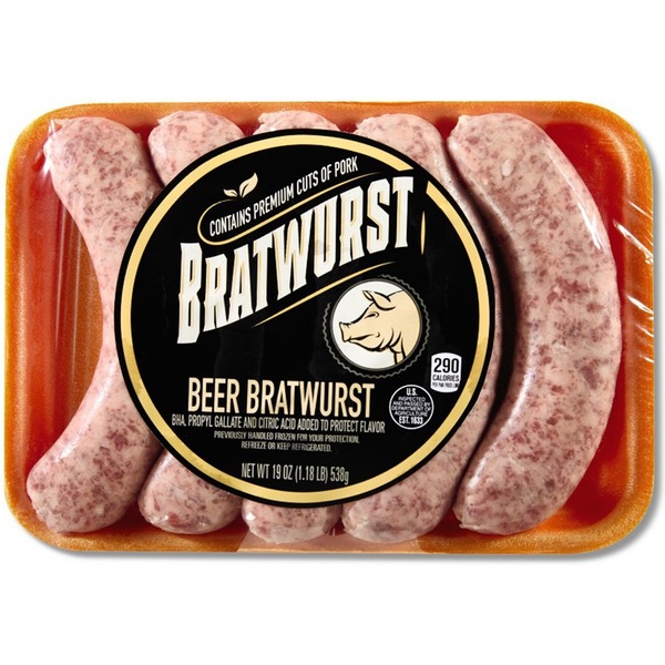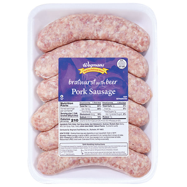Beer Pork Bratwurst offers a delightful blend of rich and robust flavors perfect for your barbecue or tailgate party. These bratwursts, often found in the Bacon & Sausage section, are specially crafted with high-quality pork, select seasonings, and infused with the classic taste of beer which contributes an extra depth of flavor.