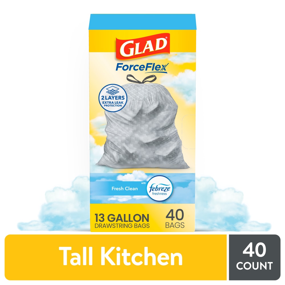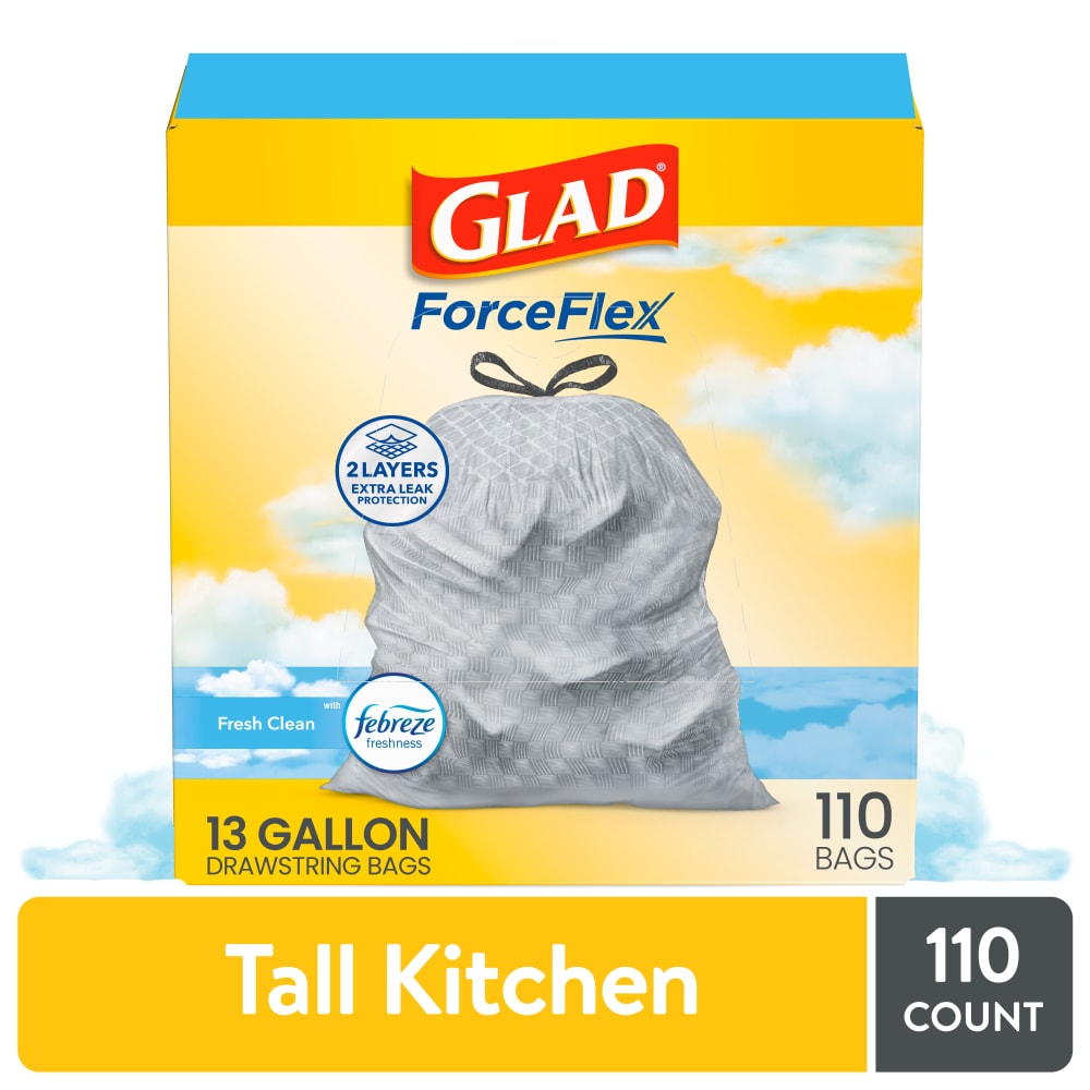 Tall kitchen trash bags (13 gallon) are specifically designed to fit into standard kitchen trash cans, providing a convenient and efficient method of waste disposal. These bags are typically made of plastic, boasting durability and resistance to prevent leaks and spills from occurring. They come in a variety of options including scented, unscented, drawstring or regular handles, and even biodegradable materials, ensuring there's a suitable choice for everyone's needs and preferences.