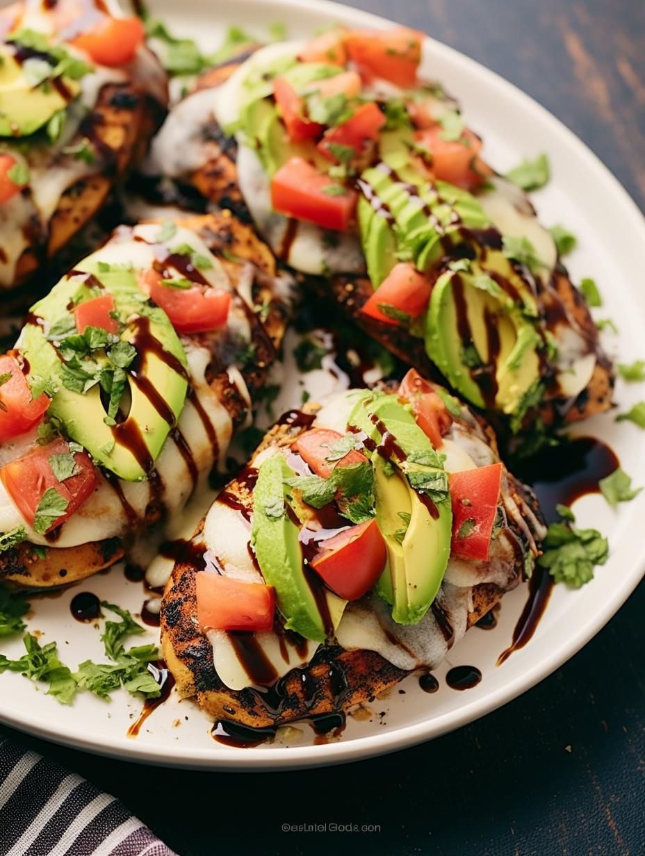 Savor the taste of Balsamic-Glazed Avocado Caprese Chicken, featuring juicy grilled chicken breasts topped with creamy mozzarella, fresh avocado, tomatoes, and basil. The honey garlic balsamic glaze adds an extra layer of deliciousness to this easy and impressive dish!
