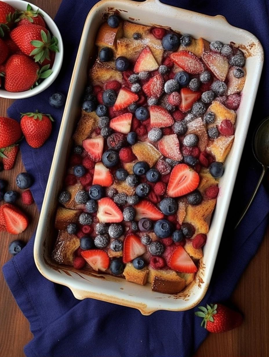 Experience breakfast heaven with this incredibly moist Bursting Berry Bliss French Toast Casserole, topped generously with fresh strawberries and blueberries. Perfect for make-ahead meals, this easy-to-follow recipe will satisfy your cravings and impress your guests. Serve with a sprinkling of powde...