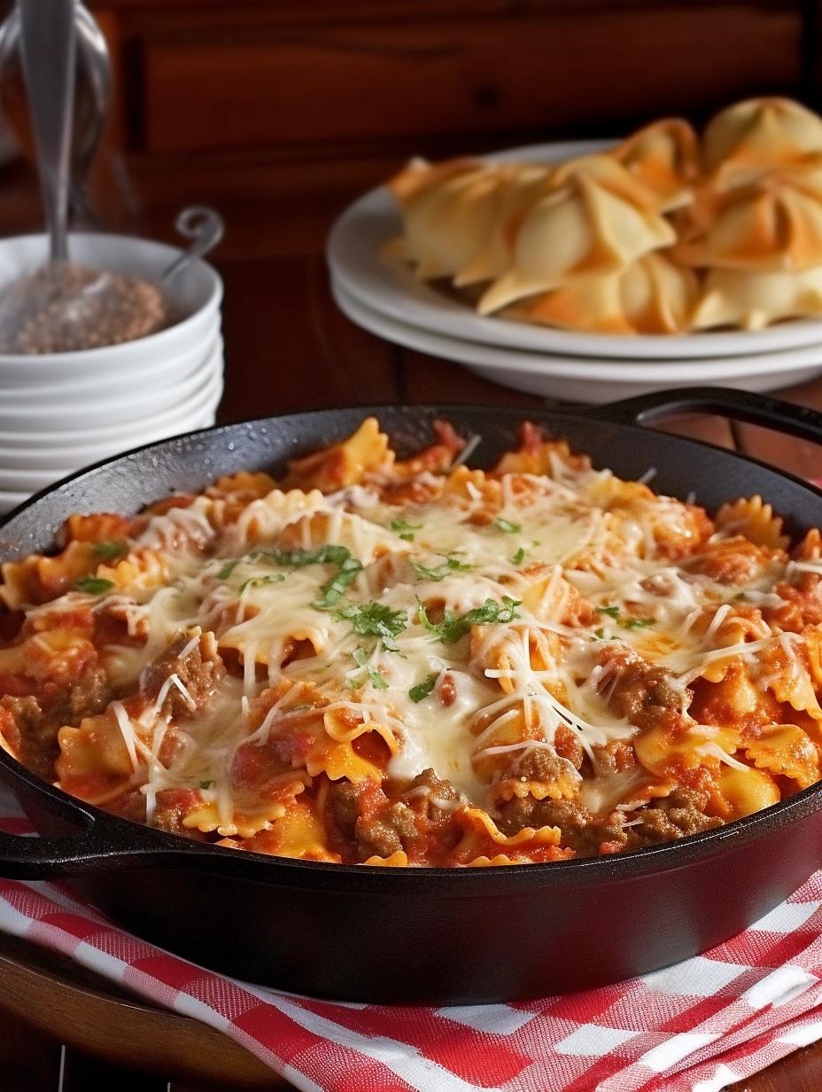 This one-skillet cheesy bowtie lasagna combines tender mini farfalle pasta, savory ground beef, and melted mozzarella cheese in a rich tomato sauce for a delicious, easy weeknight dinner that serves six.