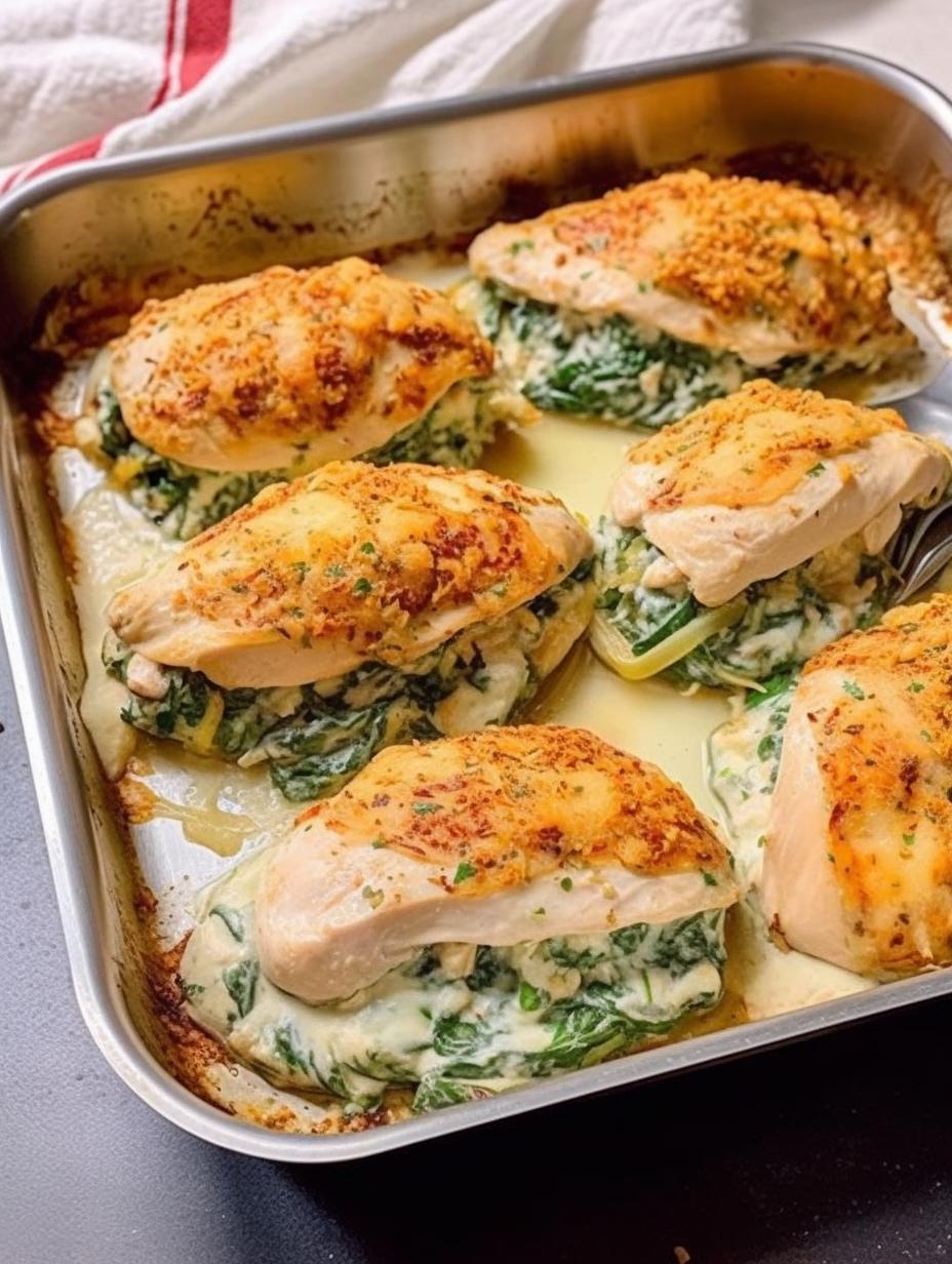A simple yet divine chicken dish, filled with a savory blend of cream cheese, spinach, and artichoke hearts with a topping of melted mozzarella and parmesan cheese. This easy-to-prepare recipe brings a gourmet feel to your at-home dining experience.