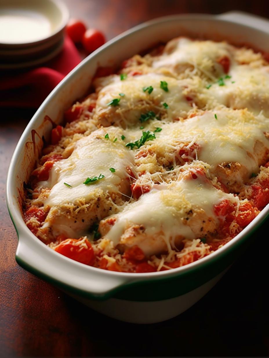 Satisfy your taste buds with this scrumptious one-dish chicken bake boasting tender chicken nestled in a bed of juicy tomatoes and topped with gooey cheese. The perfect time-saving meal for any family dinner!