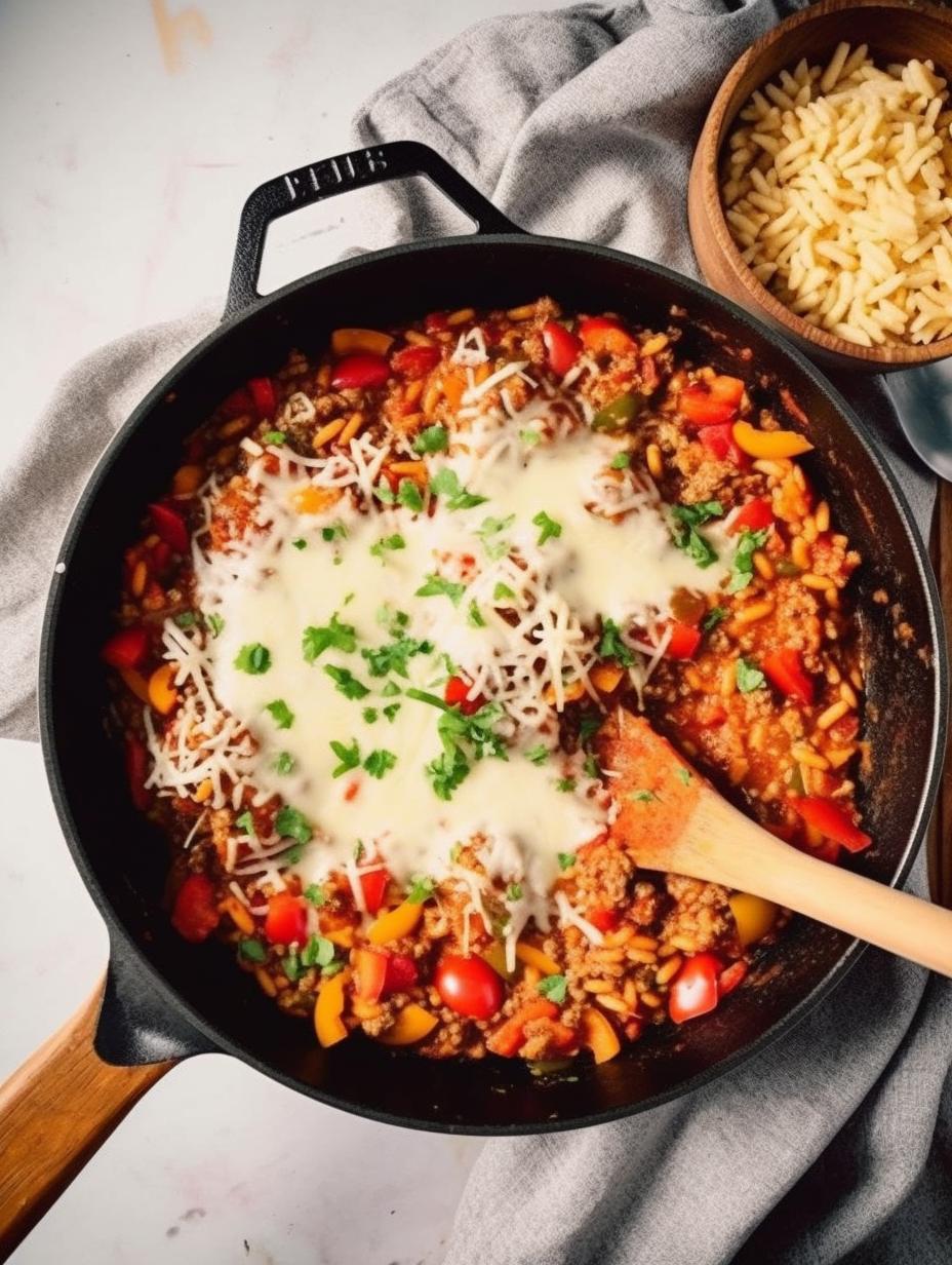 Experience an explosion of flavors with our Colorful Bell Pepper Skillet Casserole. This one-skillet wonder combines ground beef, rice, and bell peppers in a beautiful dance of flavors, rounded off by a delightful cheese blend. Perfect for those hectic weeknights when simplicity and taste both are t...