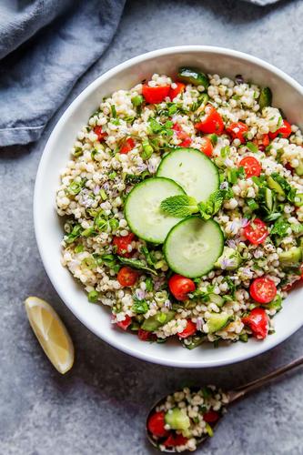 Experience a vibrant, flavorful side dish featuring tender Swiss chard, perfectly roasted peppers, and fluffy Israeli couscous, all artfully balanced with a hint of lemon.