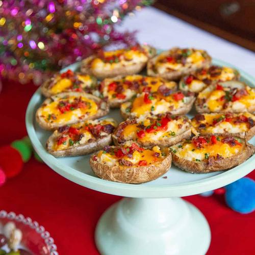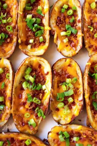 Scoop the filling into the potato skins and top with vegan cheese shreds.