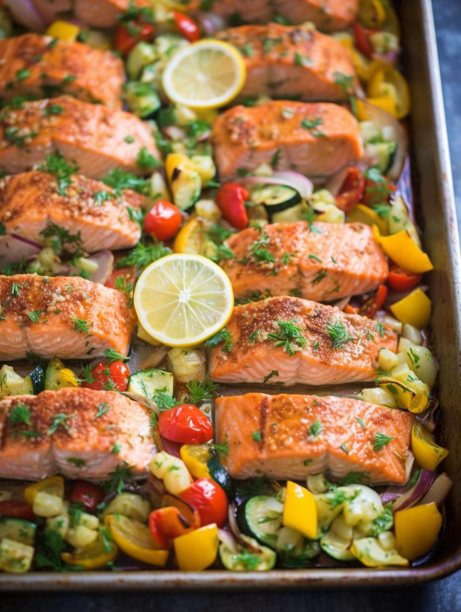 Savor the simplicity of this one-pan feast that brings together succulent salmon fillets with a colorful array of vegetables. Coated in a tangy lemon-pepper and garlic marinade and baked to perfection, this dish promises a delightful balance of flavors and nutrients.